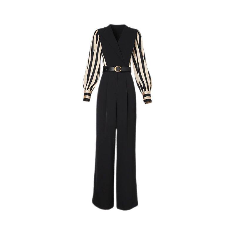 气质通勤条纹拼接高腰系带连体裤 新款 2026秋季 女D0522 送腰带