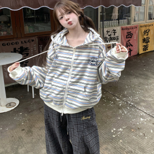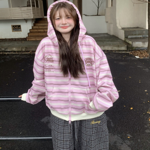 GTGA撞色条纹连帽开衫 拉链外套慵懒风宽松休闲上衣 卫衣女秋冬新款