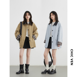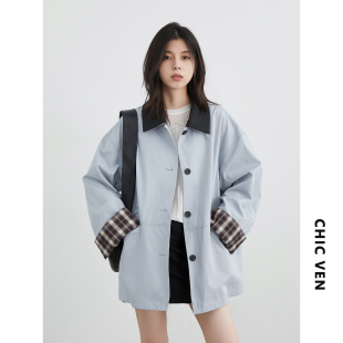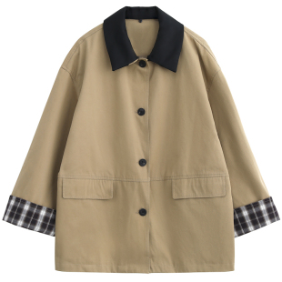 巴恩风撞色格纹风衣外套皮领大衣女大码 新款 胖mm 2026春季 CHICVEN