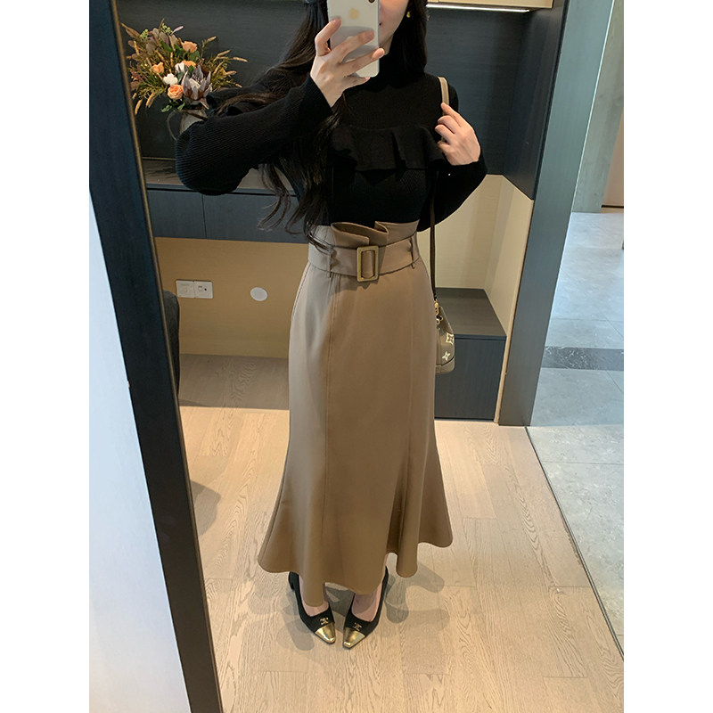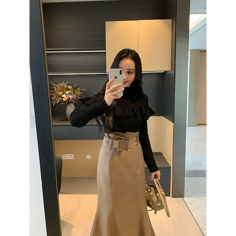 高腰鱼尾半身裙显瘦套装 XINYI 荷叶边针织毛衣 秋季 女 月下清荷