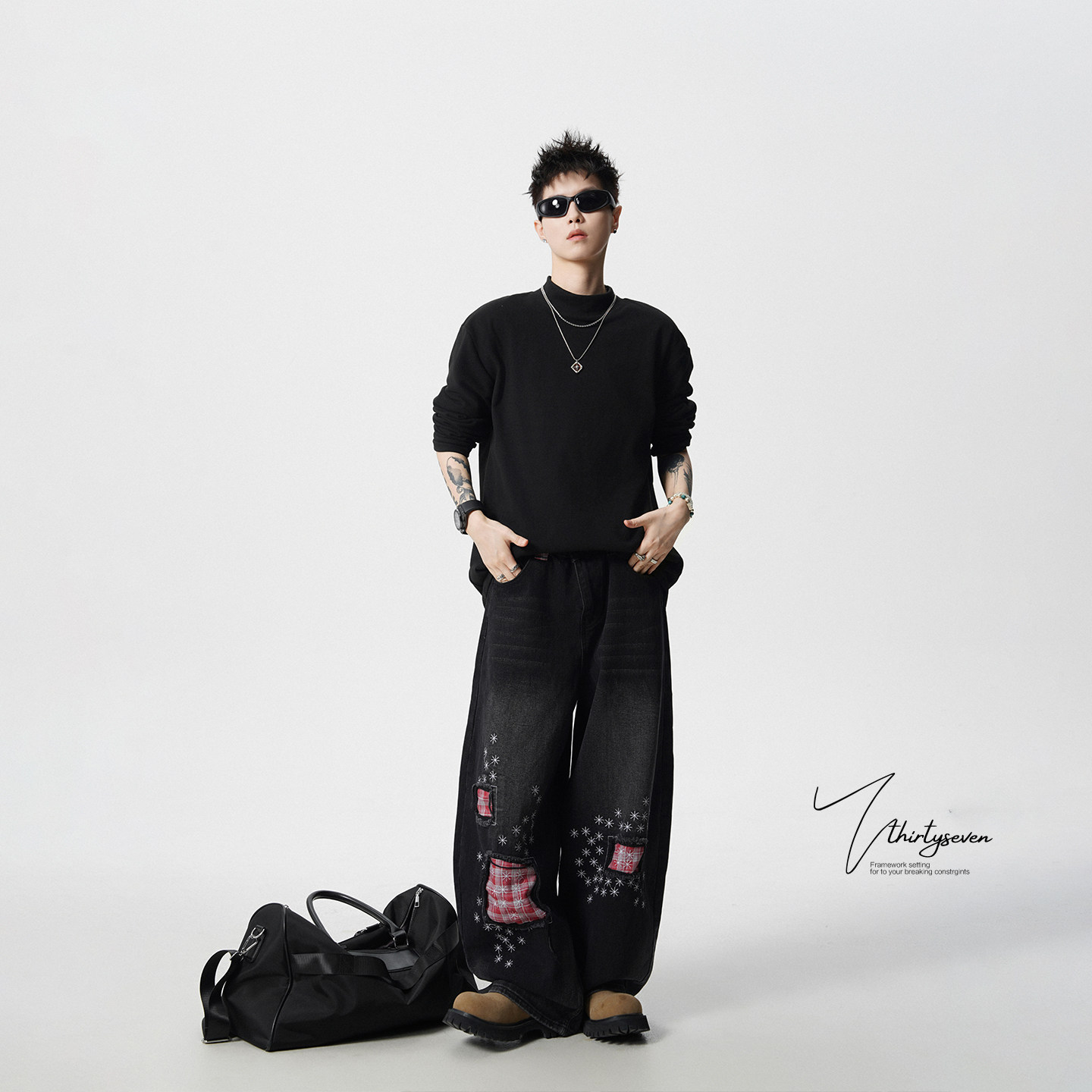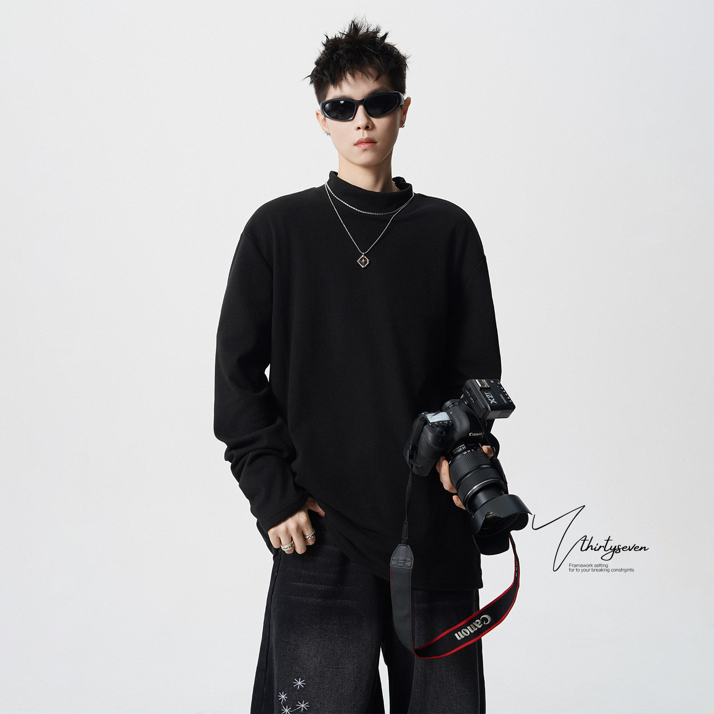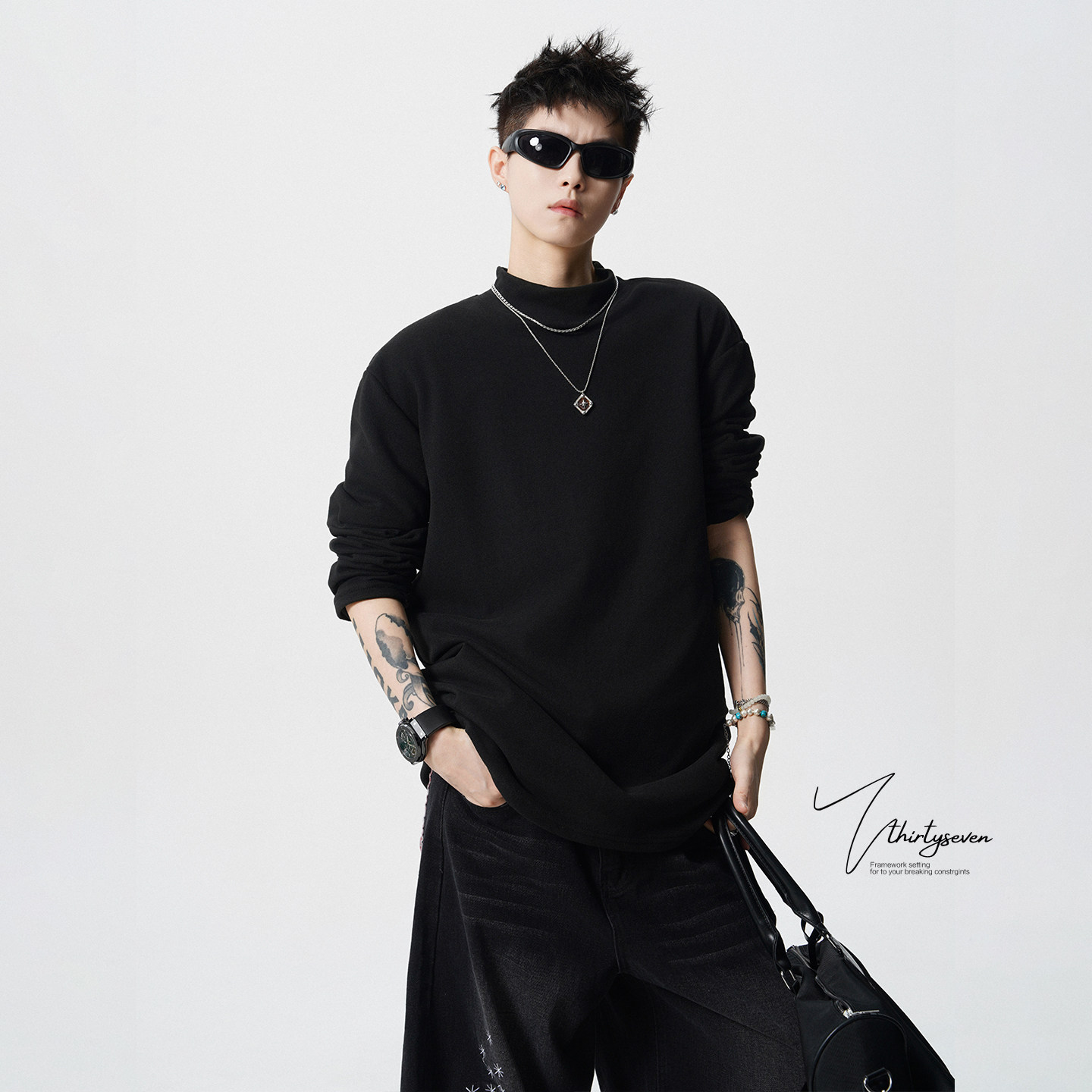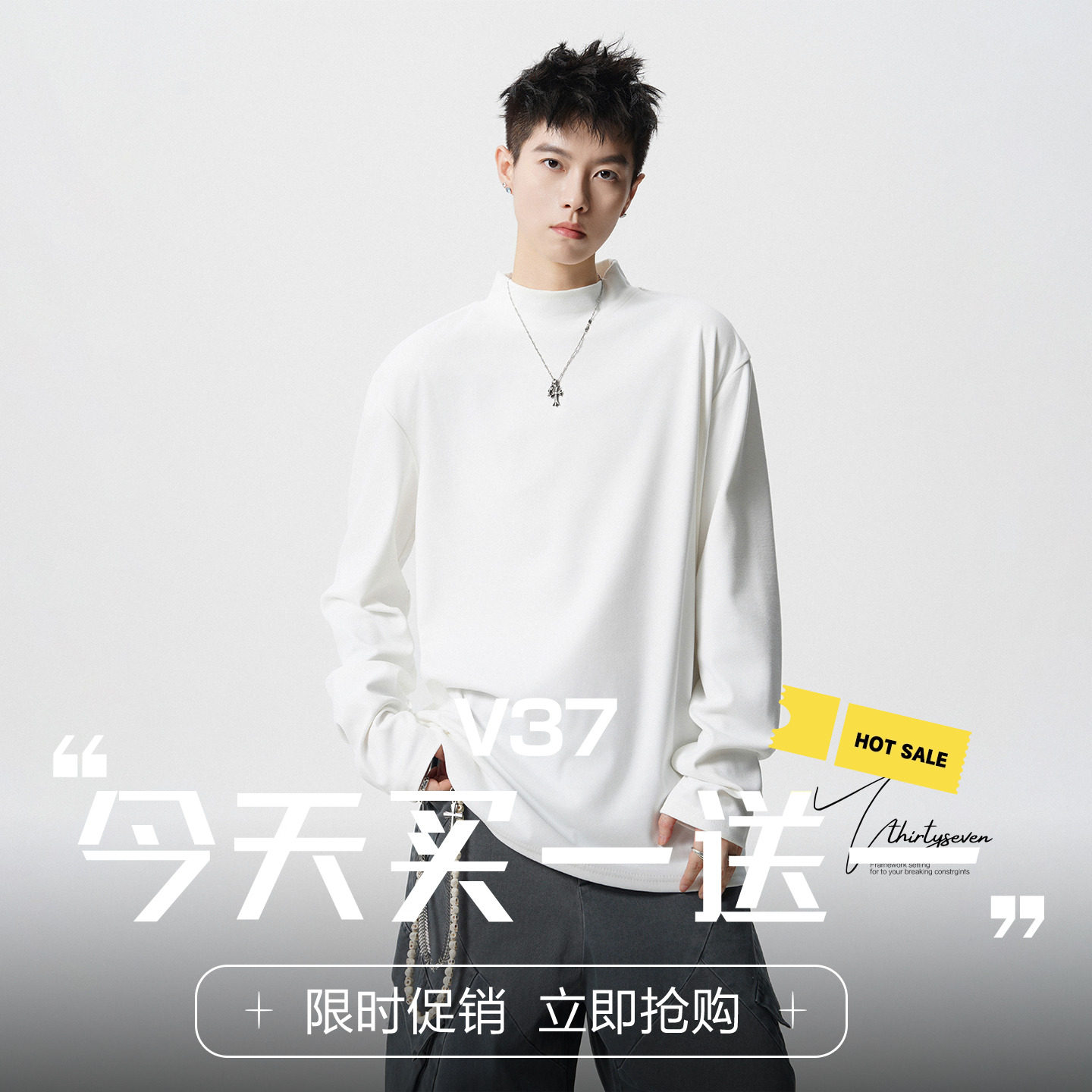 潮牌复古情侣打底衫 T恤男秋季 高街休闲上衣 半高领德绒长袖 V37美式