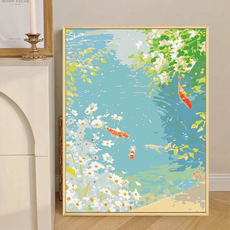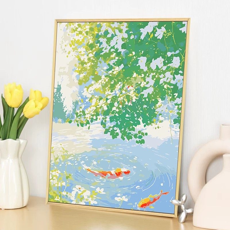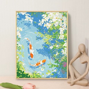 池塘锦鲤成品装 饰画仿油画风景唯美治愈小清新寓意卧室客厅摆挂画