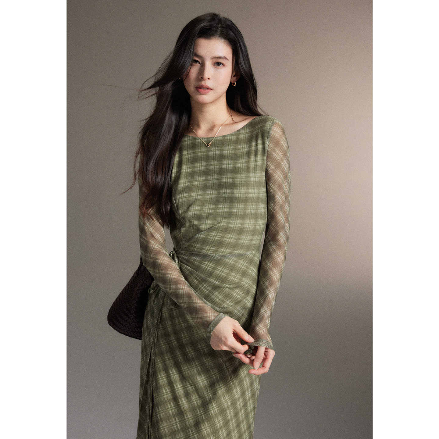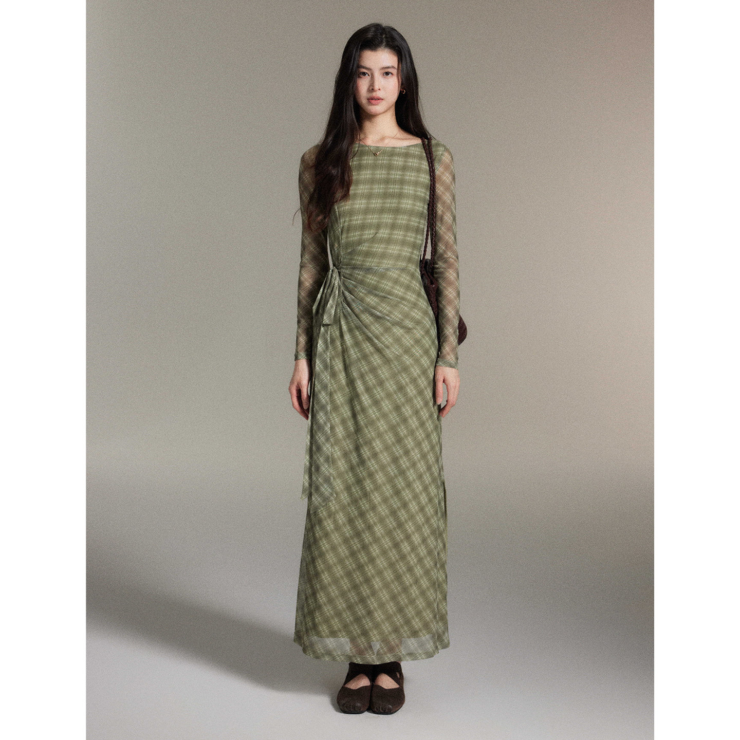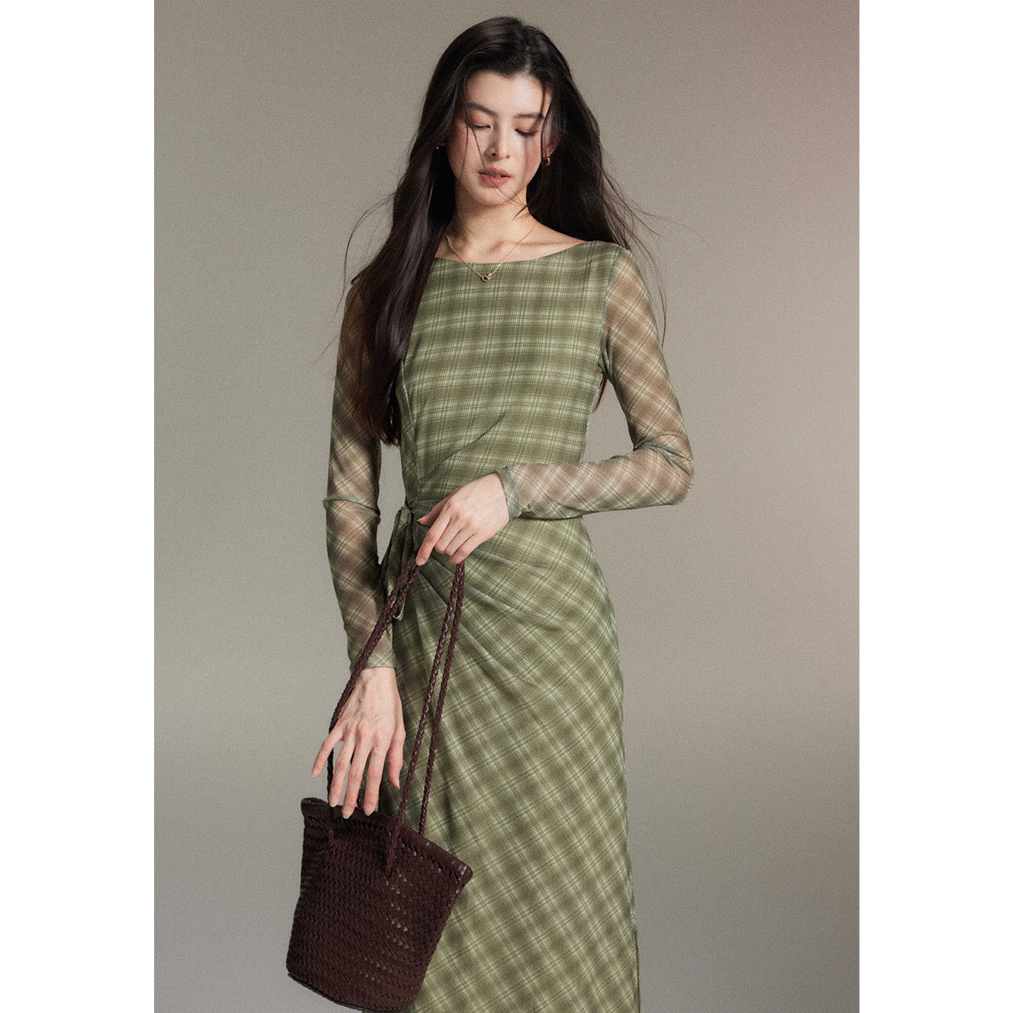 网纱侧收腰修身 温柔风绿色格纹连衣裙女长袖 长裙 序秋 贰羊设计