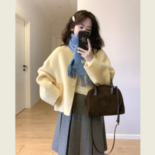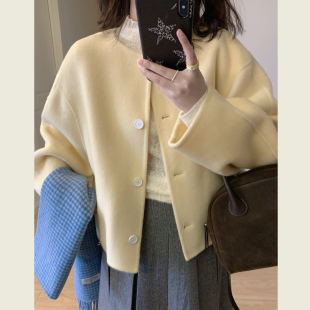 温柔风黄色短款 小个子圆领单排扣呢子大衣 减龄毛呢外套女秋冬装
