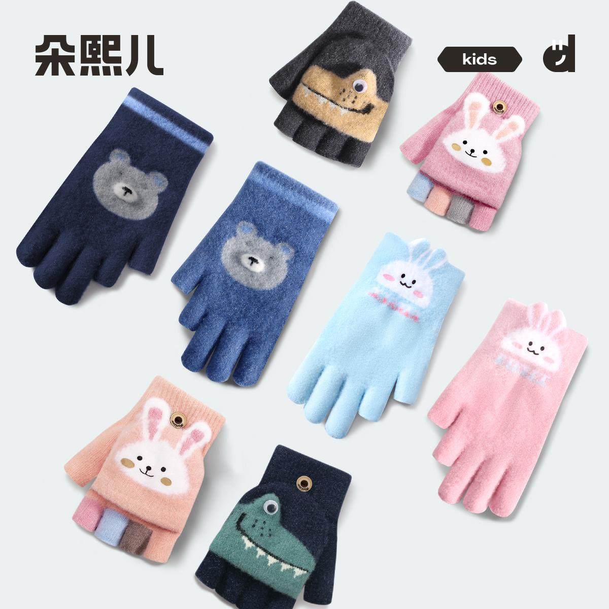 朵熙儿 加绒保暖男女童翻盖露指学生写字手套防冻 儿童手套秋冬季