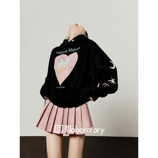 周里物出品「奇幻粉心」黑色加绒卫衣女2026春季 印花连帽上衣 新款