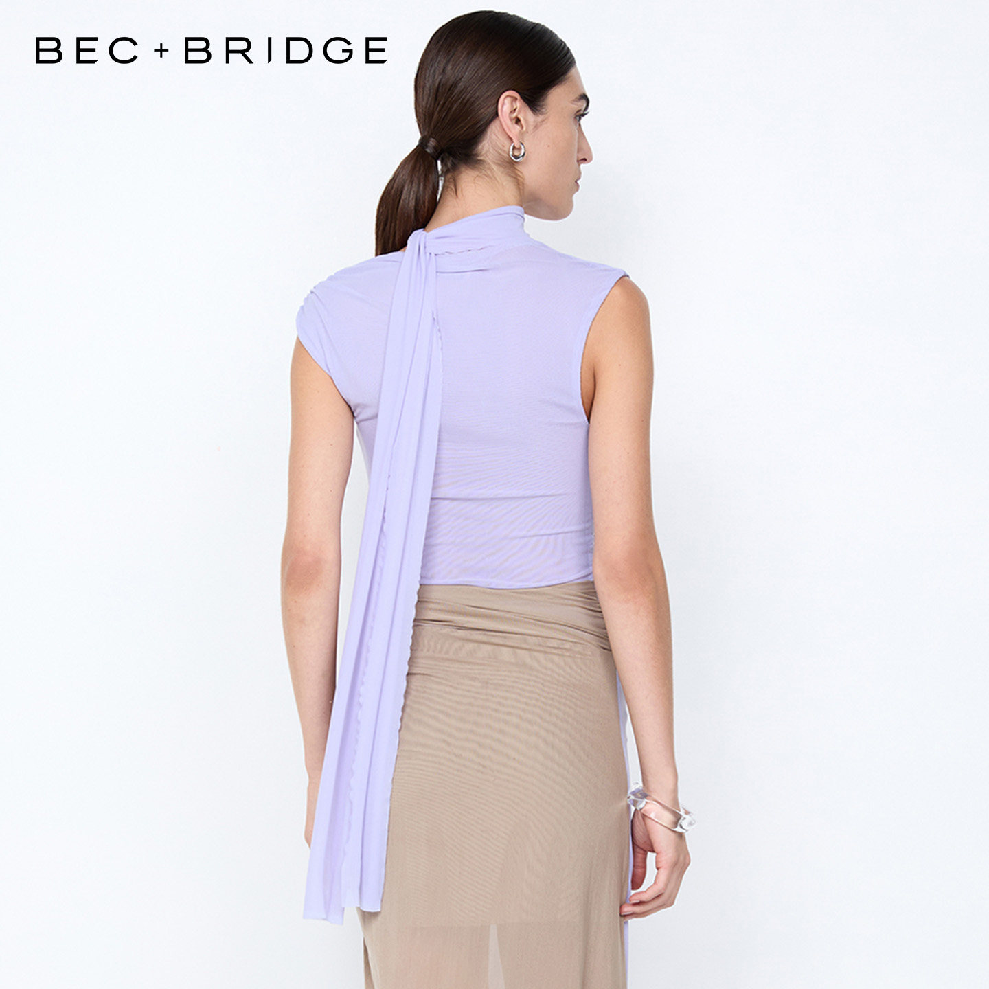 BECBRIDGE 13163 CONNI拼接露腰不对称挂脖拼色扭结网纱连衣裙H25