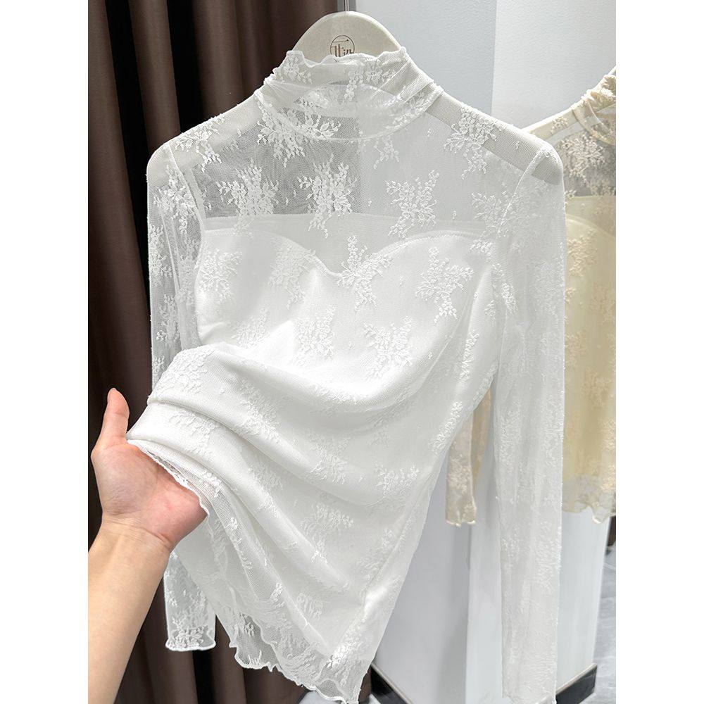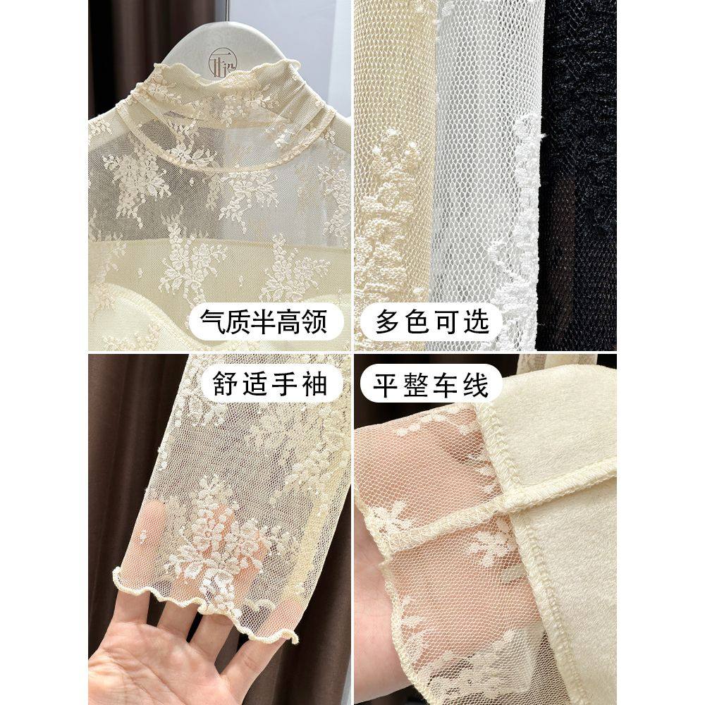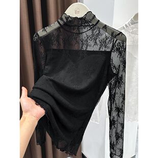 上衣 木耳边高级感叠穿内搭网纱修身 高领蕾丝拼接打底衫 女春秋新款