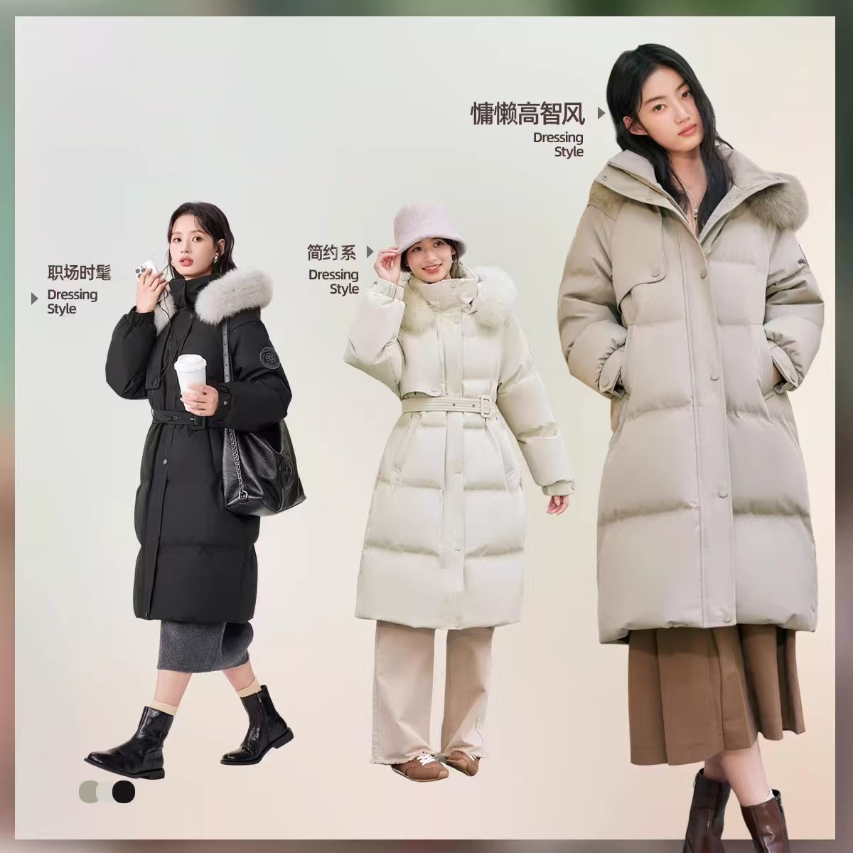 鸭鸭户外羽绒服女2025秋冬新品 翻领加绒宽松90鸭绒外套J 中长款