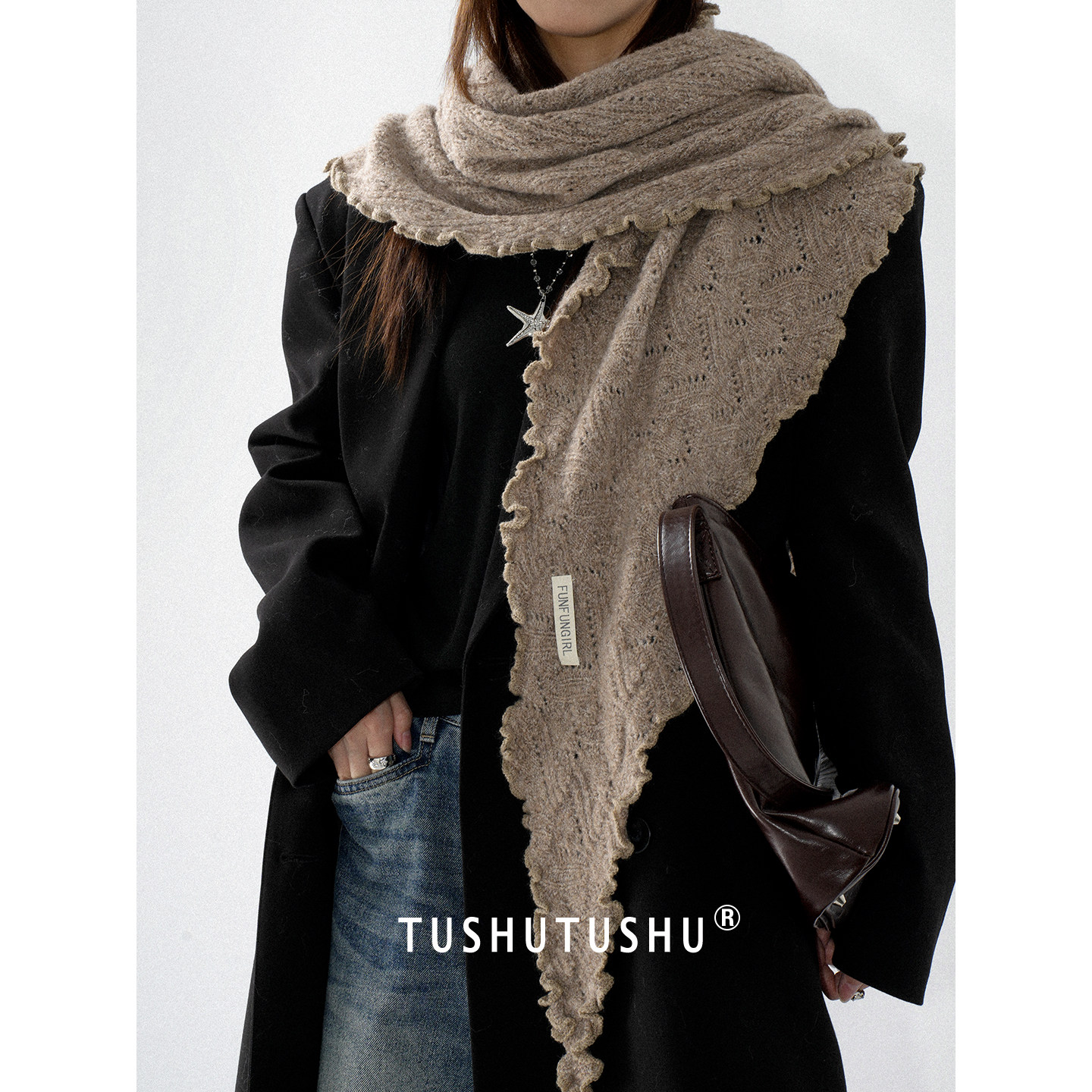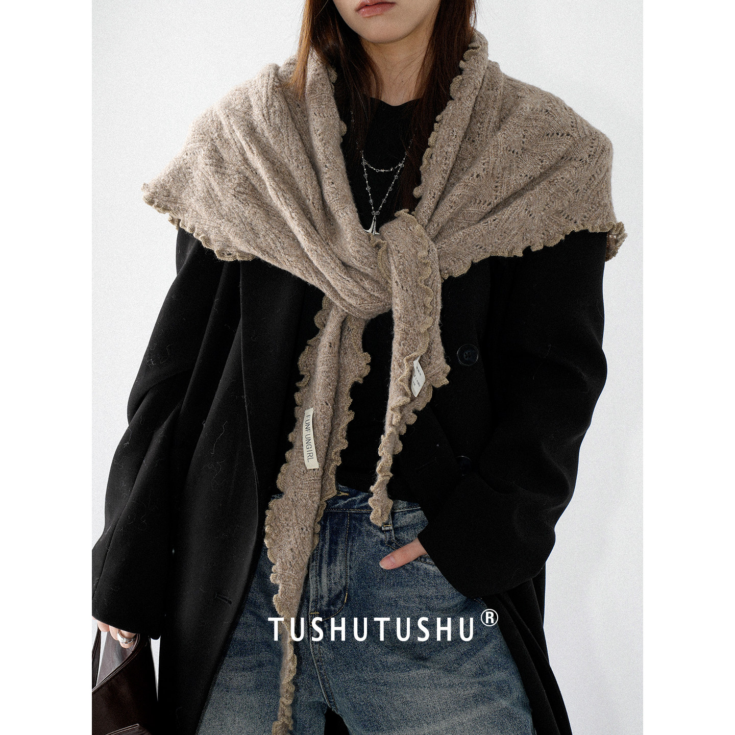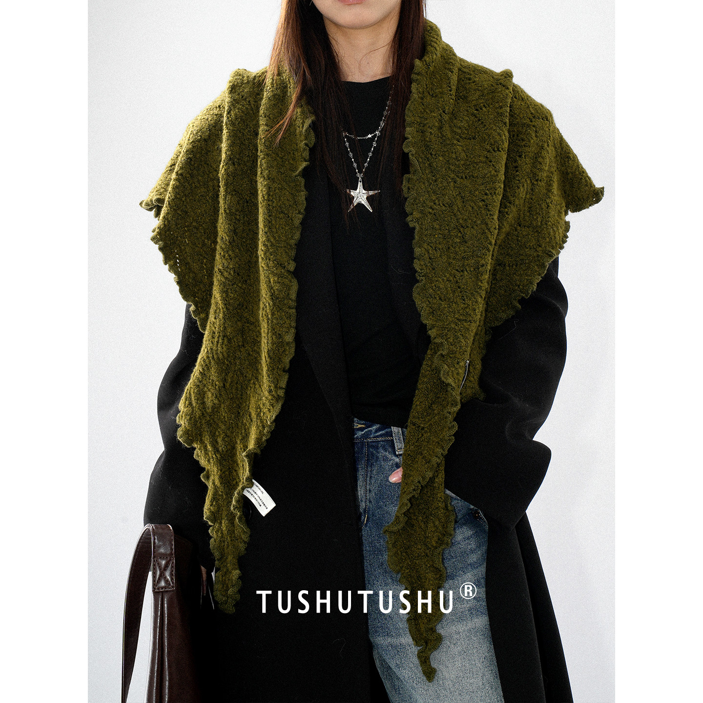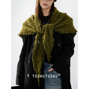 TUshu 氛围杀低调橄榄绿~秋冬木耳边三角巾围脖百搭保暖围巾披肩