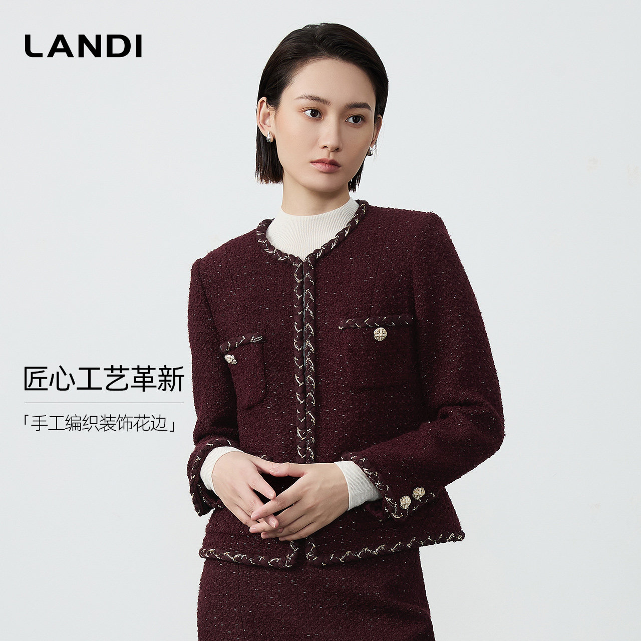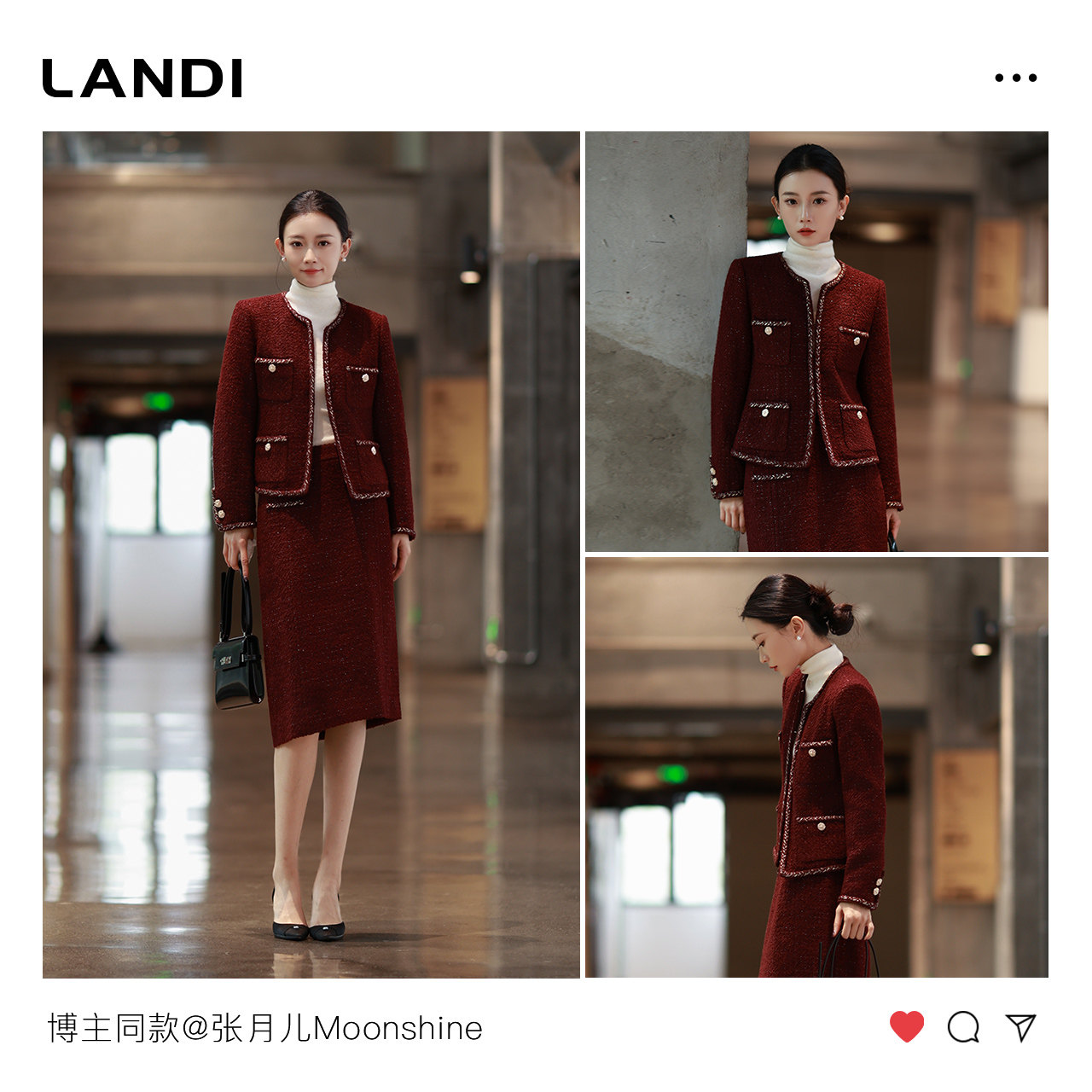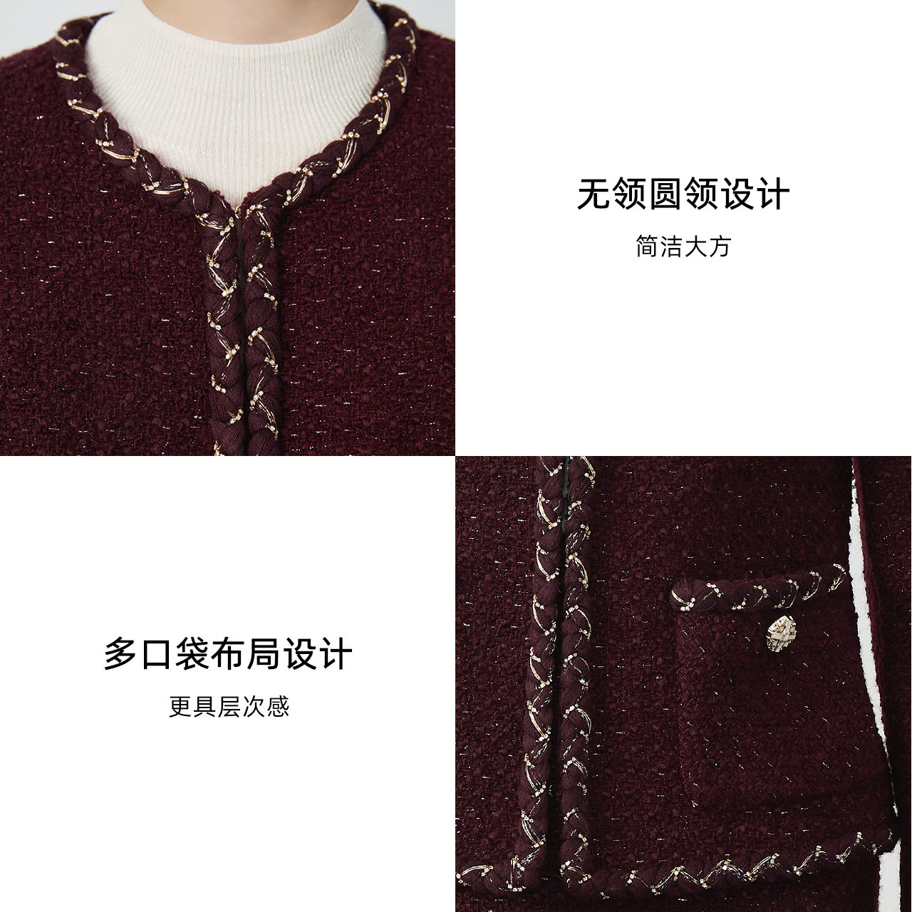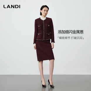 LANDI酒红色绵羊毛金葱小香风短外套女套裙2025冬新品 精致衣橱