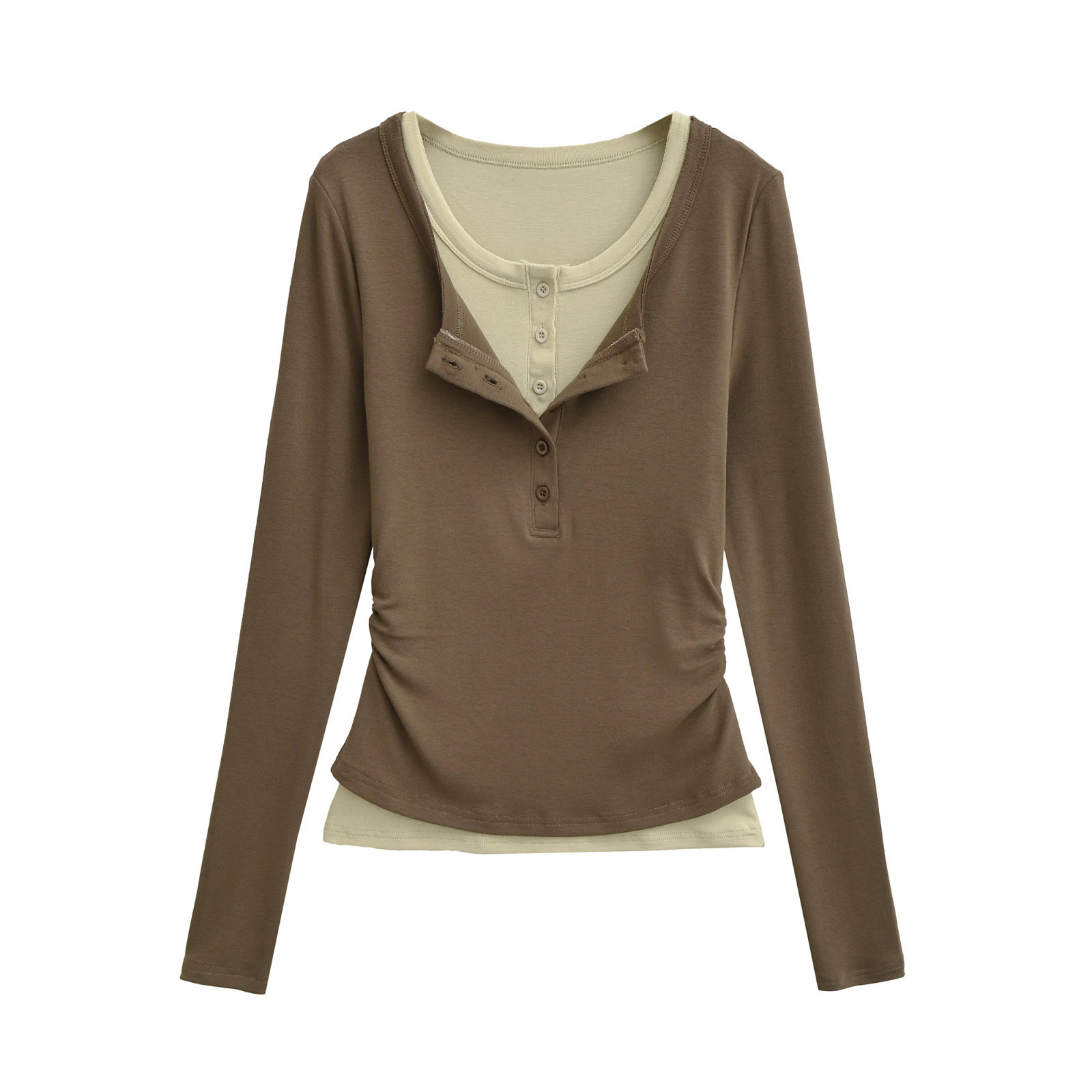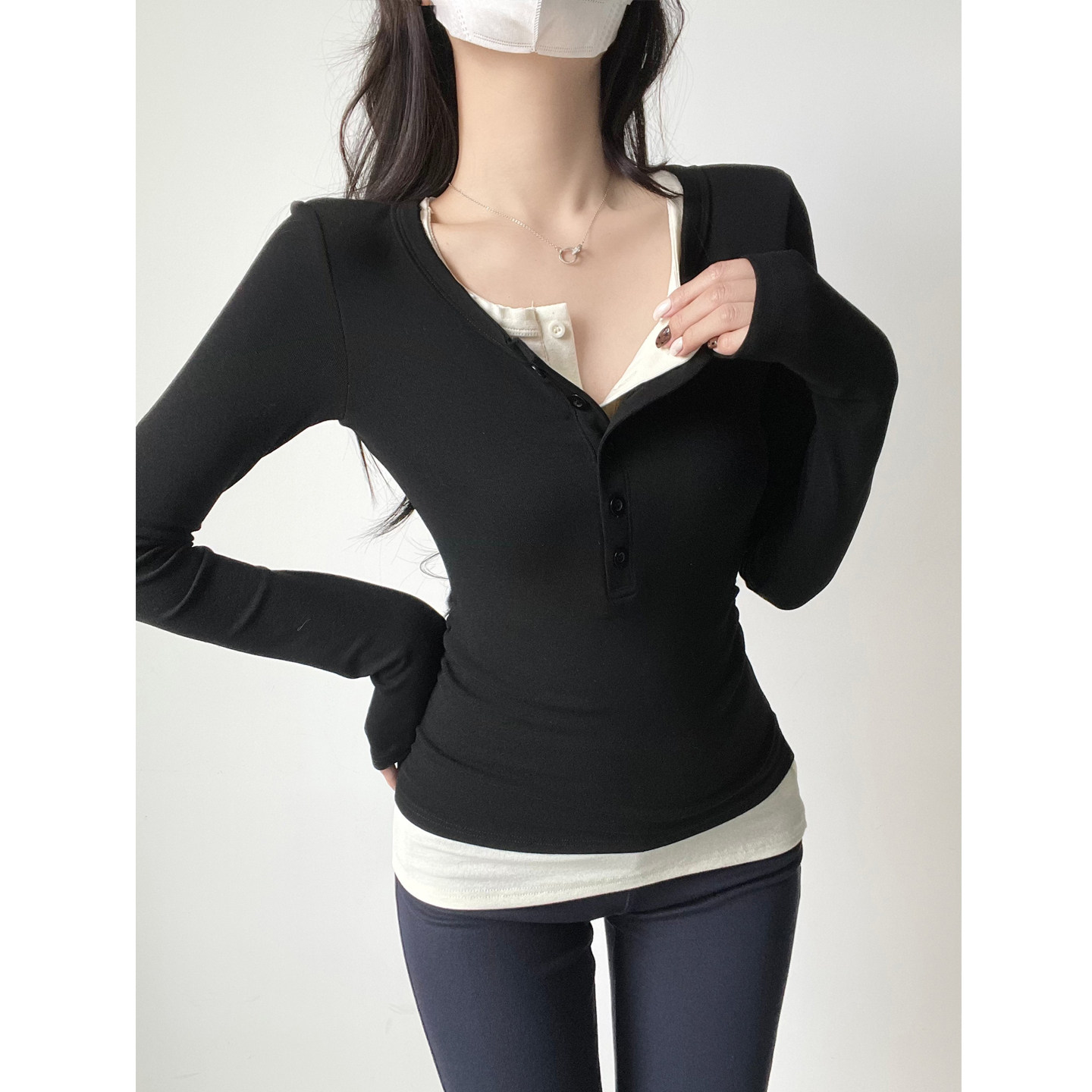 复古亨利衫 上衣秋季 假两件长袖 打底衫 T恤女柔软触感舒适修身 美式