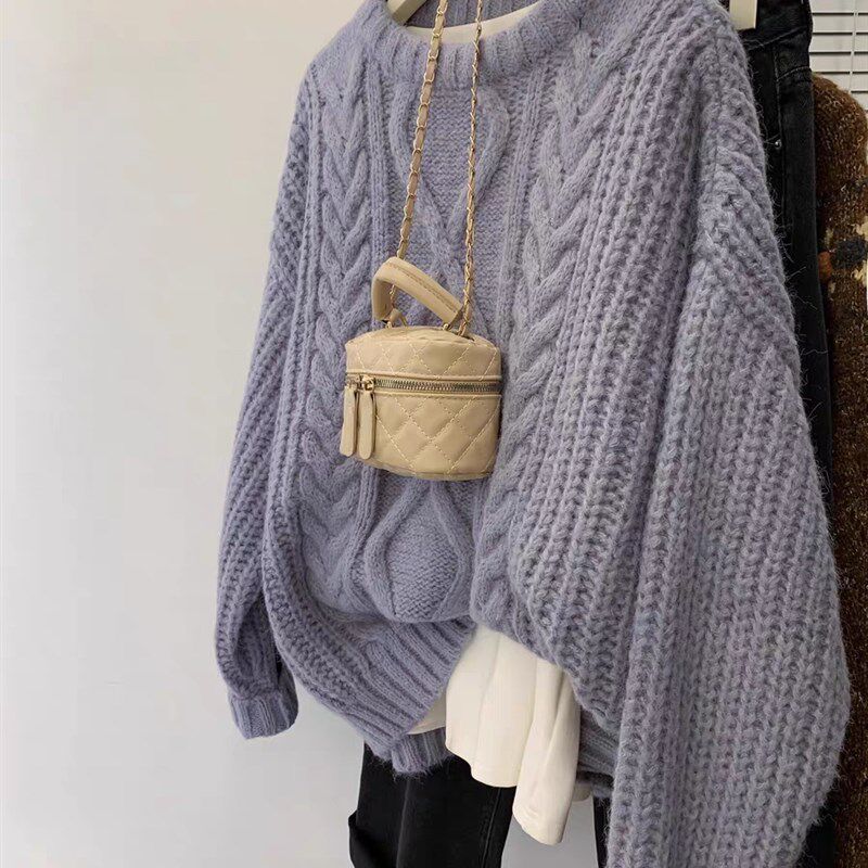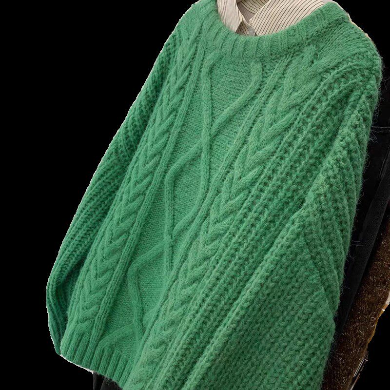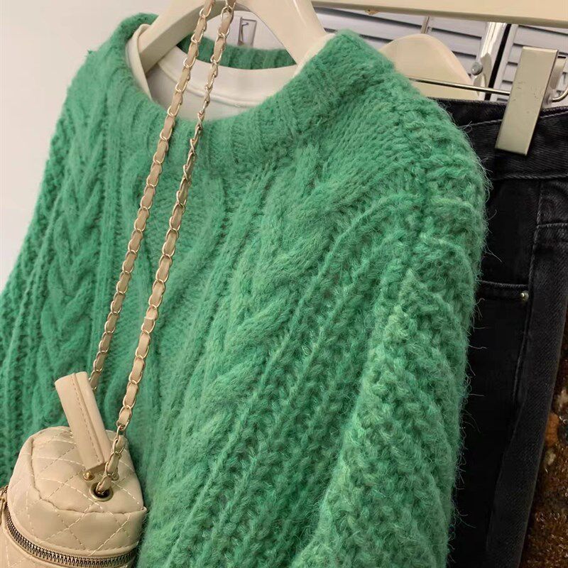 绿色麻花套头圆领针织毛衣女秋冬季 软糯慵懒风外穿小个子2023新款
