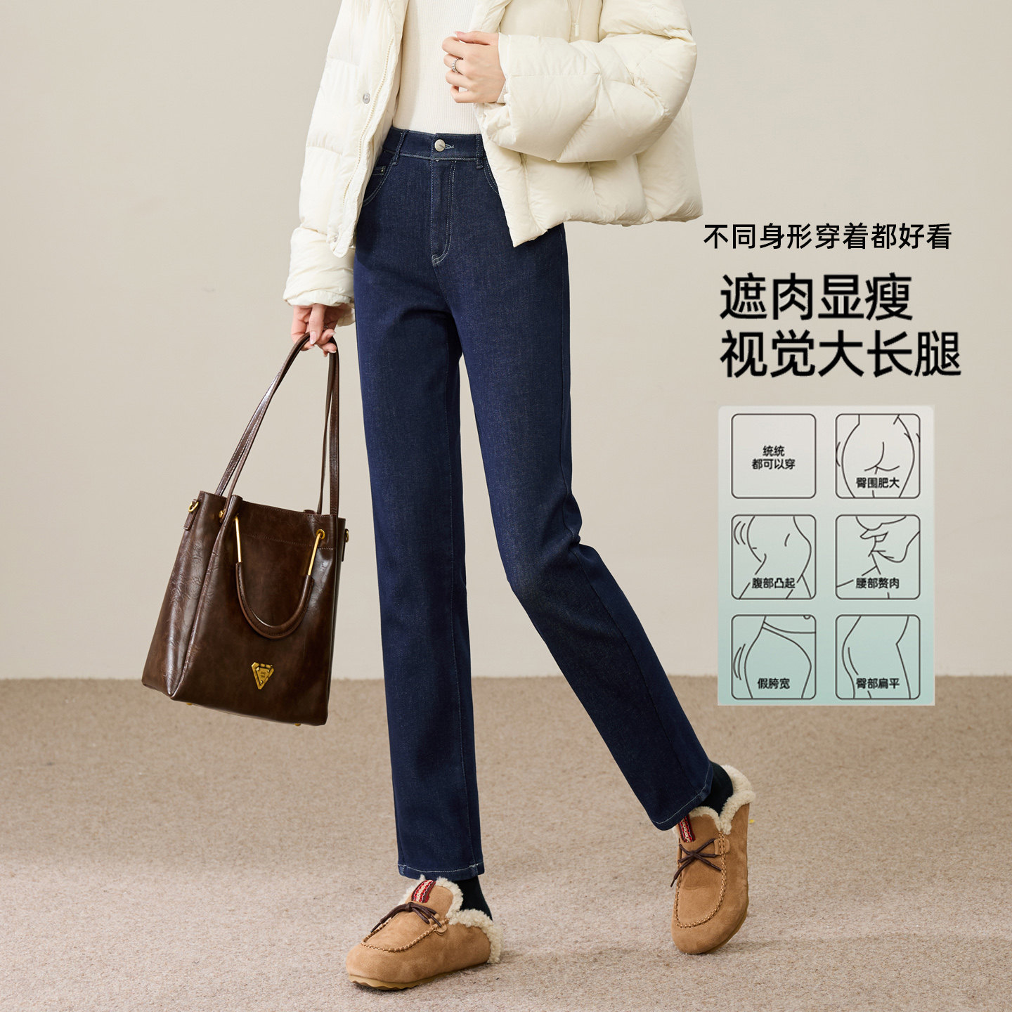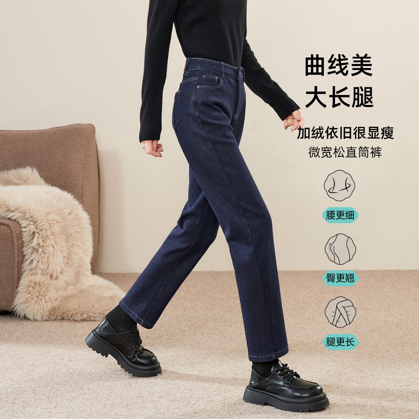 逸阳深蓝不掉色高腰直筒牛仔裤 女秋冬宽松显瘦加绒加厚保暖烟管裤