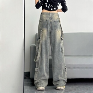 女高街设计感高腰显瘦阔腿裤 特大码 风多口袋牛仔裤 胖mm工装 潮 女装