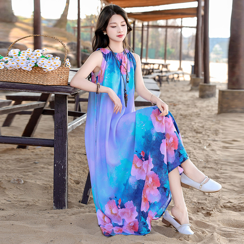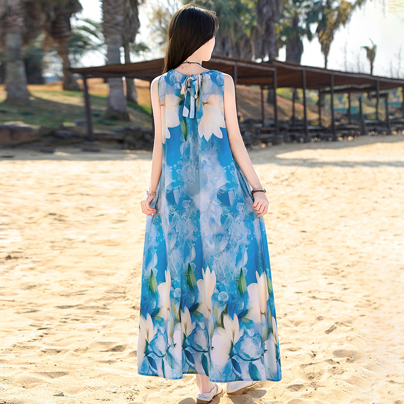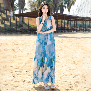波西米亚风印花棉绸连衣裙女夏无袖 气质度假风妈妈蓝色花朵裙 长款