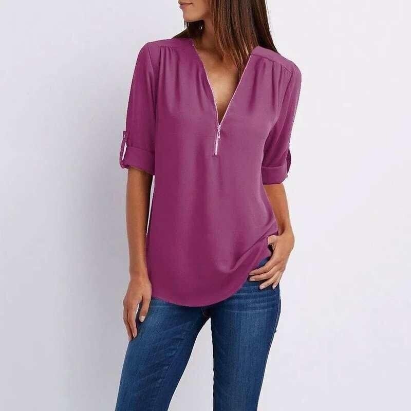 Blouse Woman Purple Solid Casual Color Neck Fashion Zipper