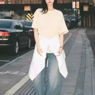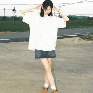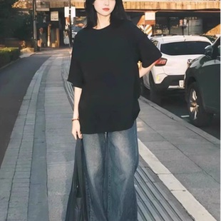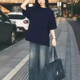 夏纯色宽松百搭设计感简约中长款 t恤女2026新款 上衣 短袖 200斤大码