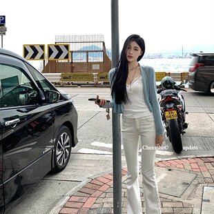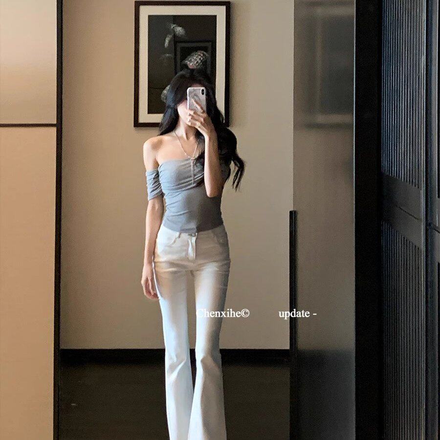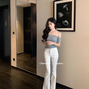 女夏显瘦双腰头设计高腰撞线拖地长裤 何晨曦 复古剪裁微喇牛仔裤