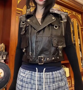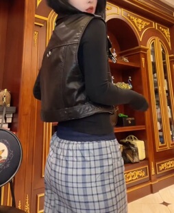 牛皮油蜡皮翻领马甲无袖 真皮皮衣女短款 机车马夹拉链 新款 2026春季