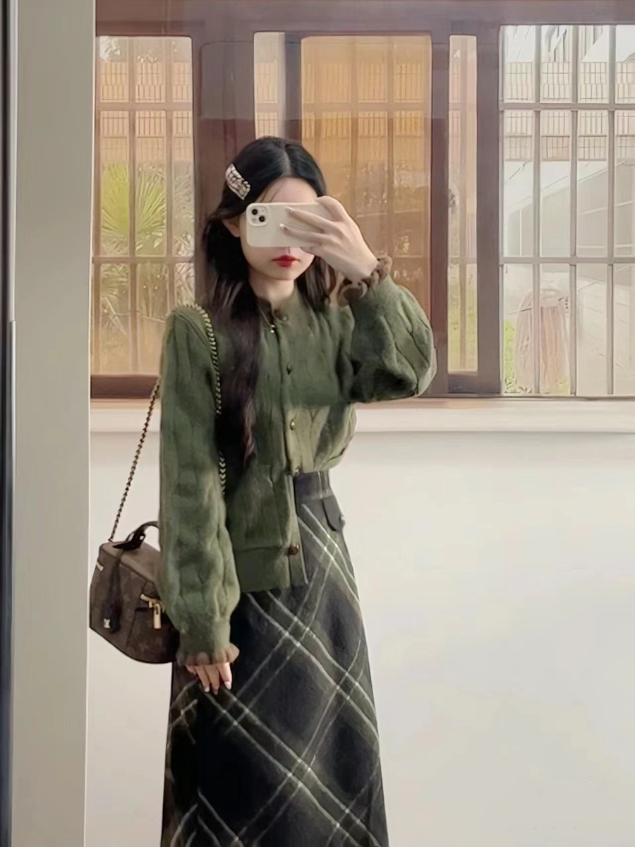 裙子两件套装 桔梗温柔风绿色开衫 女 搭配一整套茶系穿搭法式 早秋装