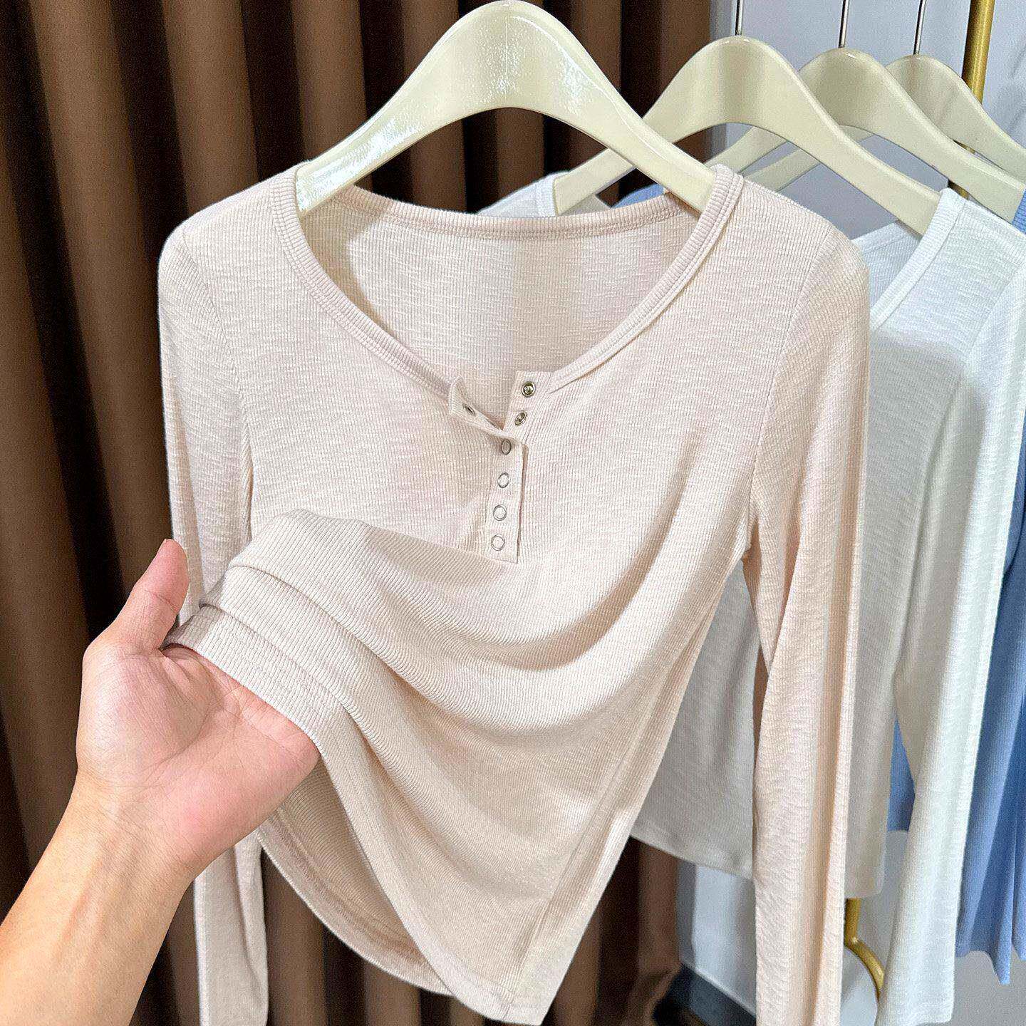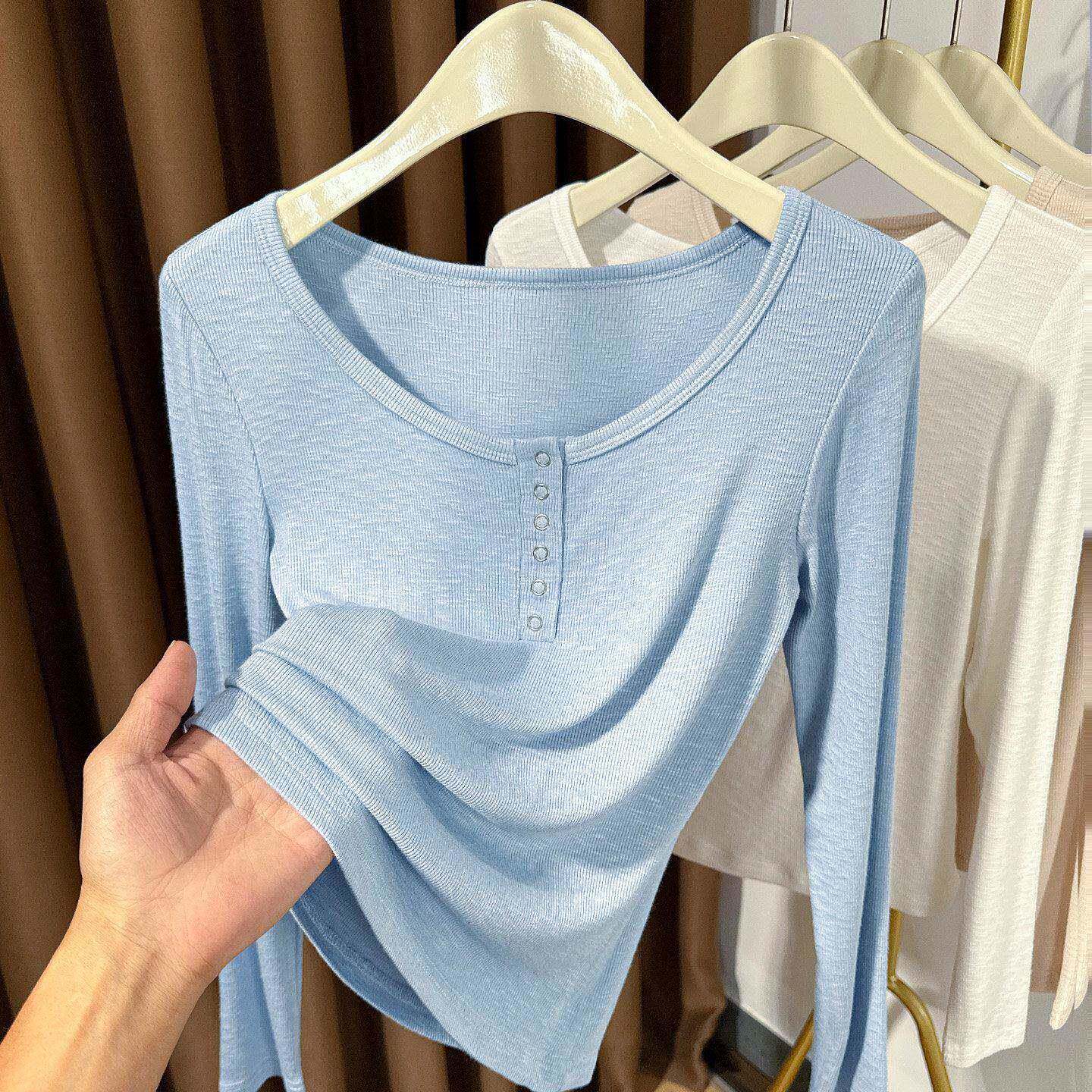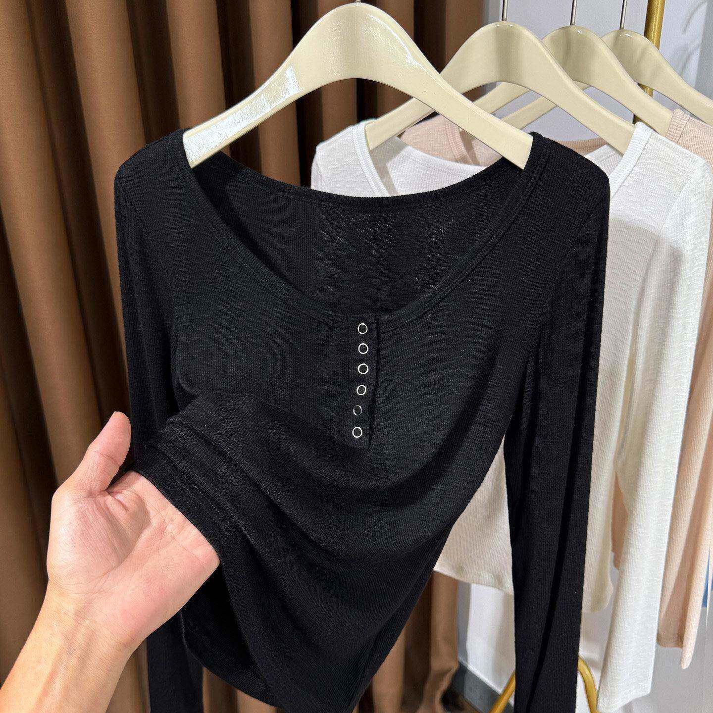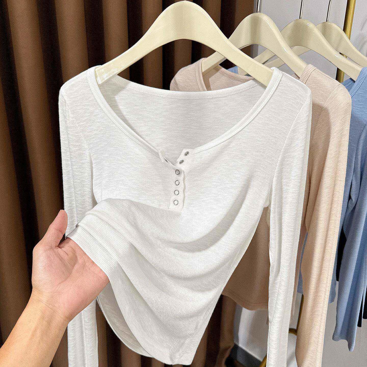 螺纹内搭纽扣半开领0325z 薄款 春夏大圆领白色针织长袖 T恤女新款