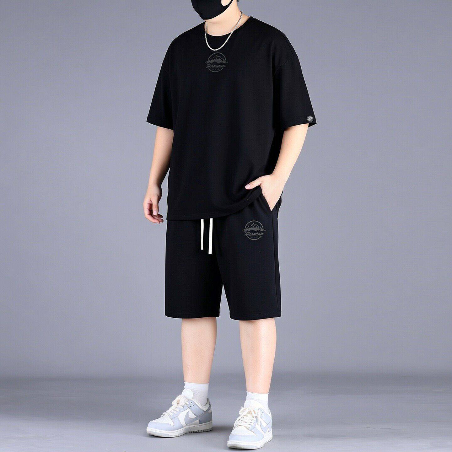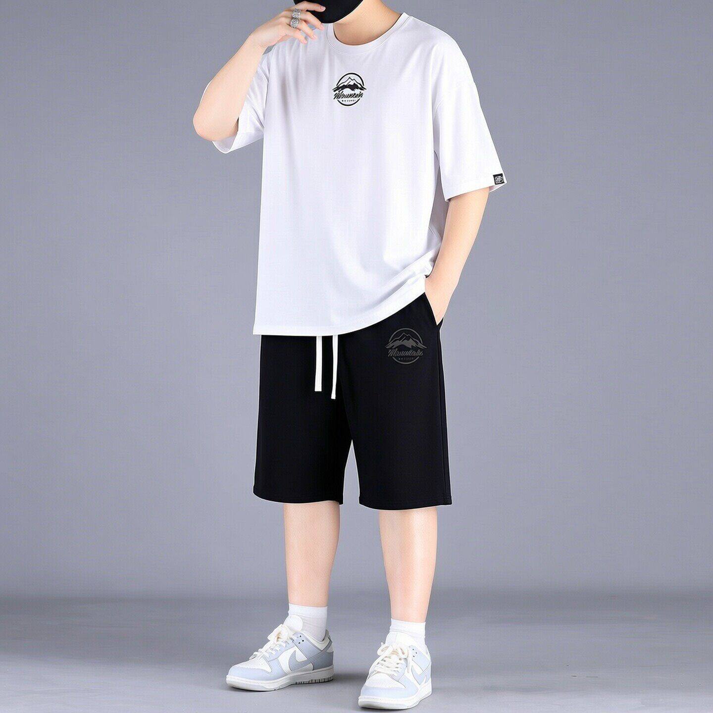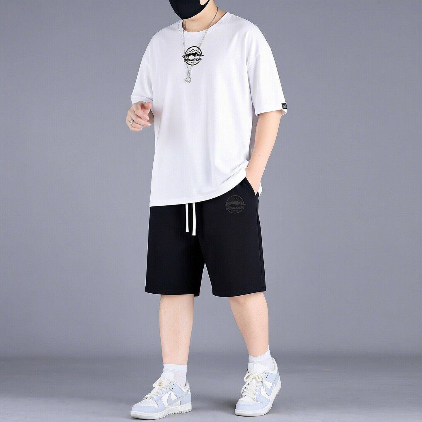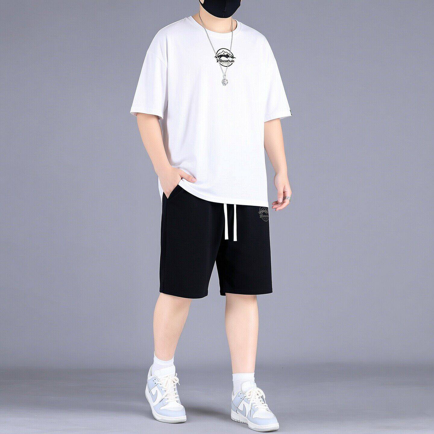 夏季 潮牌休闲套装 薄款 加肥加大胖子白色短袖 两件套 大码 五分裤 男士