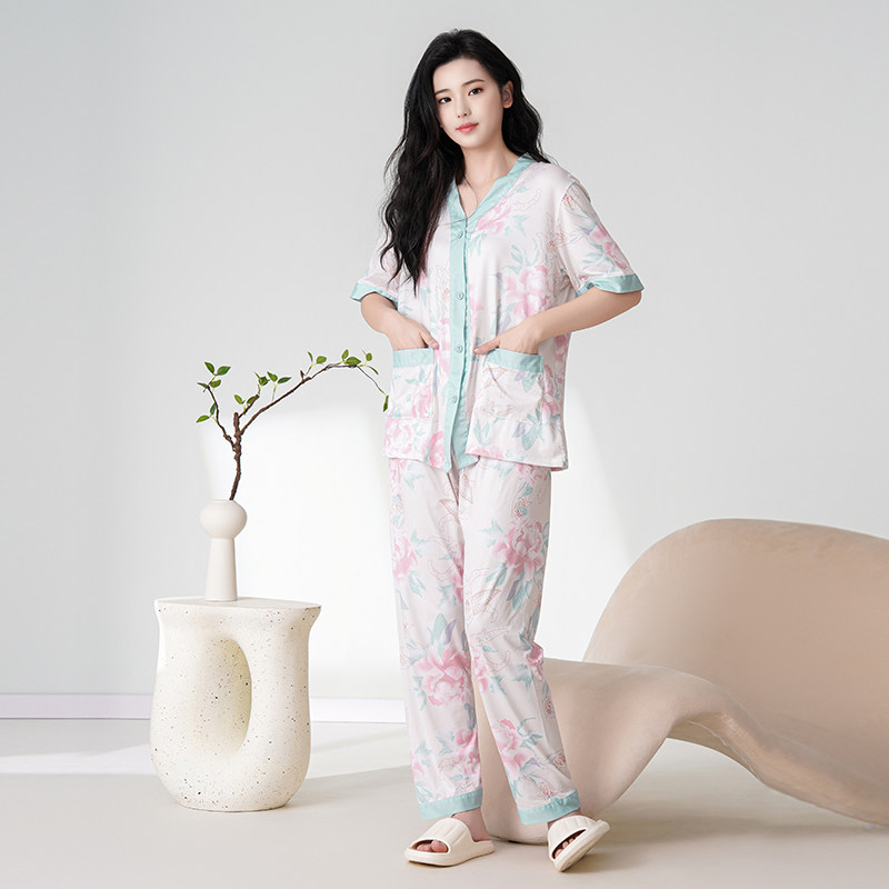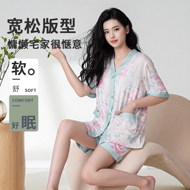 休闲宽松舒适家居服套装 奢莱蔻睡衣女夏薄款 三件装 和服领长裤 短袖