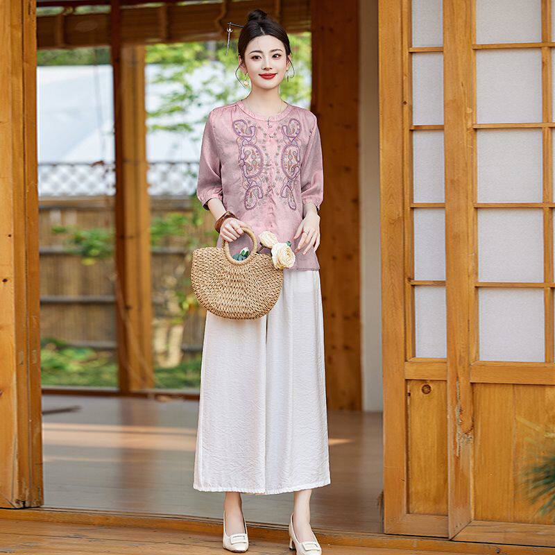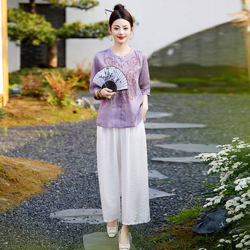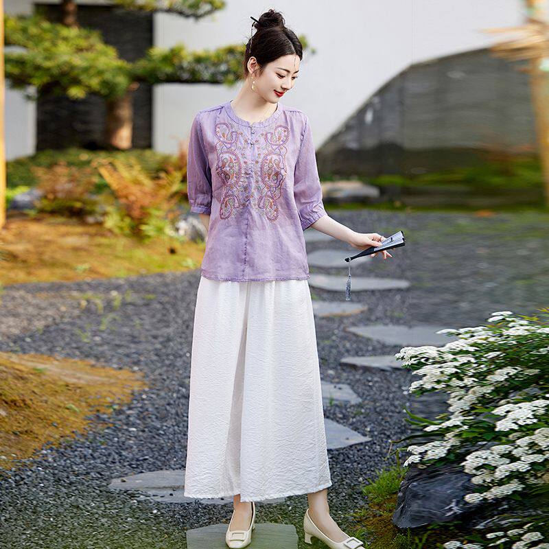 套装 中式 圆领紫色上衣九分裤 中袖 复古风刺绣两件套女夏季