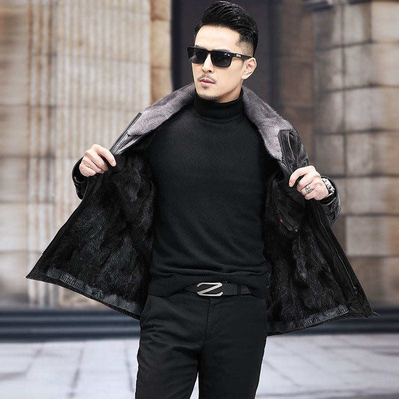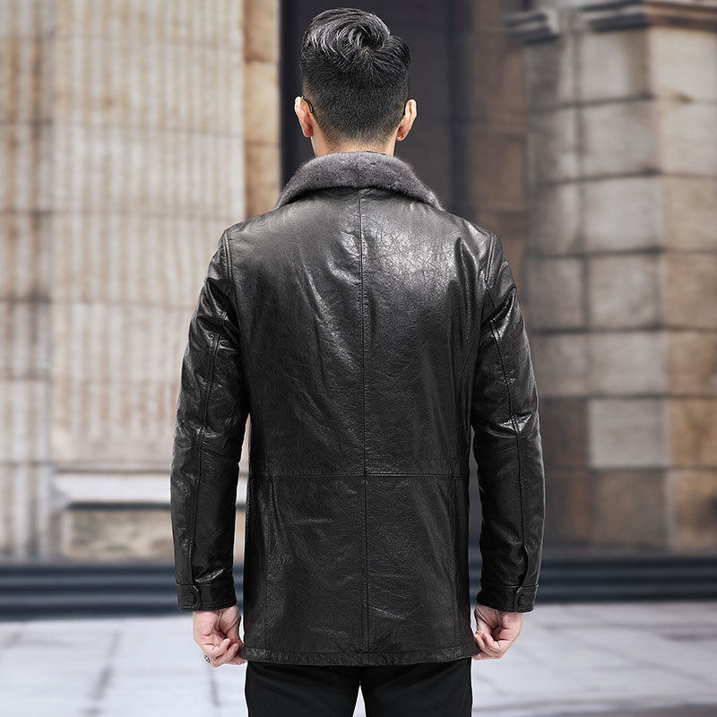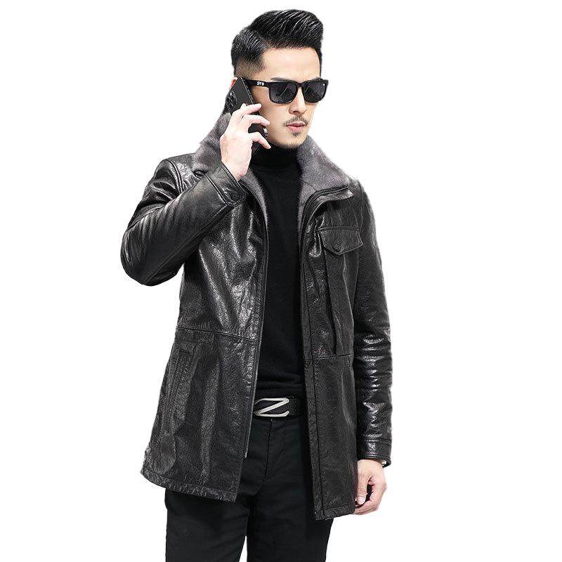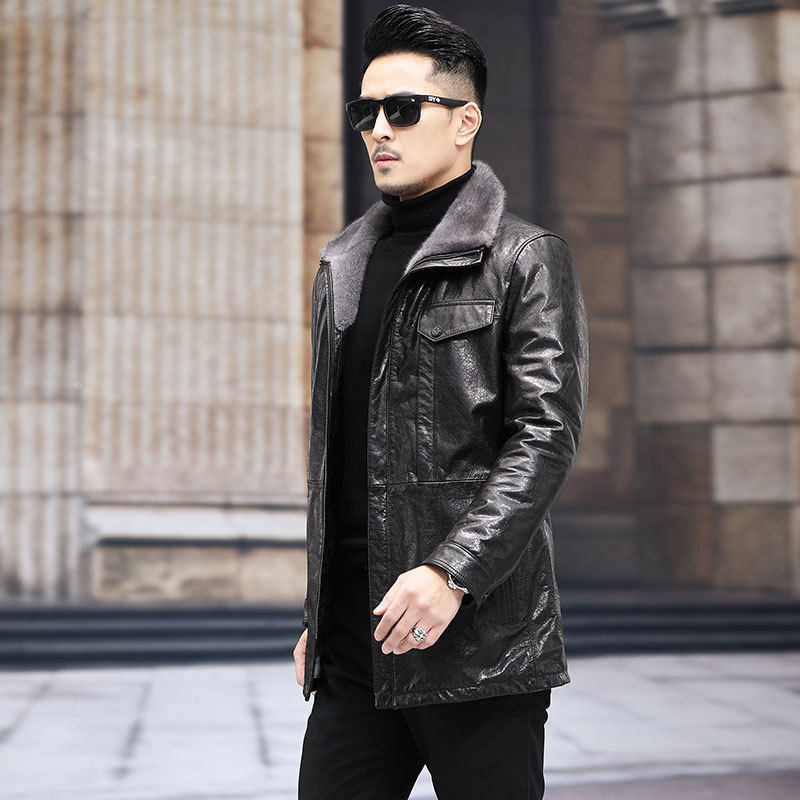 水貂内胆翻领修身 头层牛皮真皮男士 加厚保暖皮衣 中长款 秋冬新款