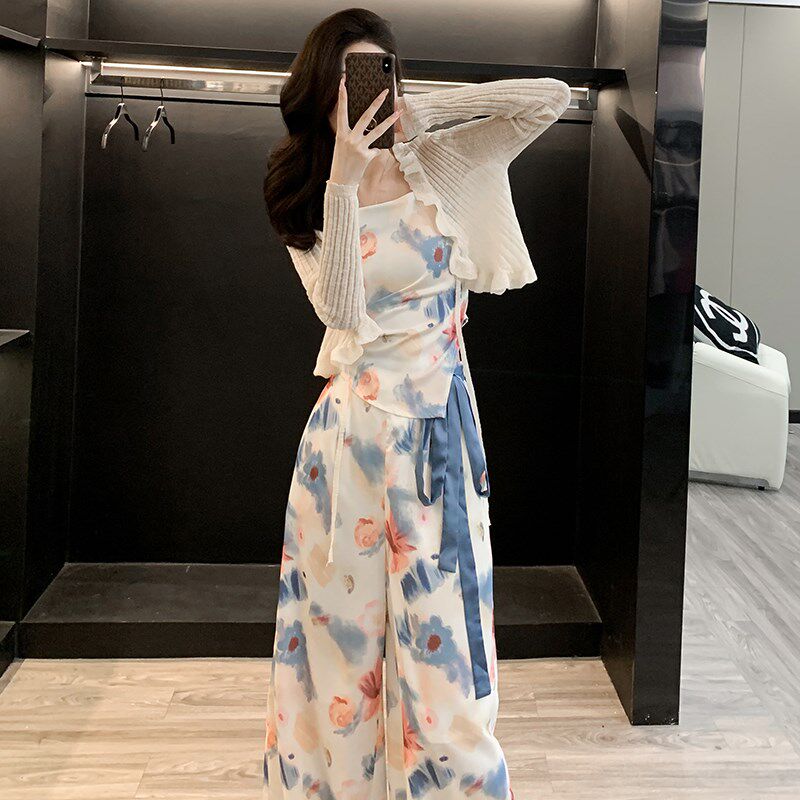 时尚 高级感茶系一整套穿搭女装 海边度假吊带防晒衫 新款 三件套 夏季