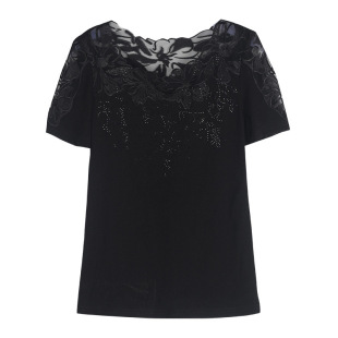 洋气镶钻绣花短袖 蕾丝花边小衫 女式 上衣T恤衫 夏季 纱衣小衫 新款