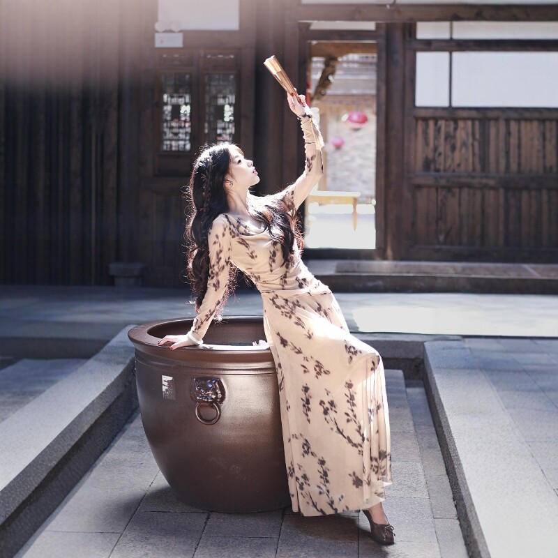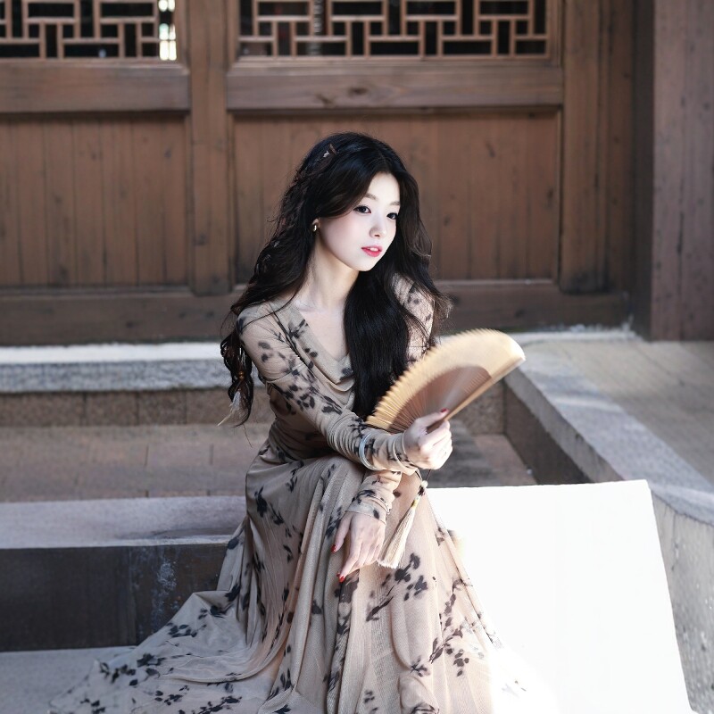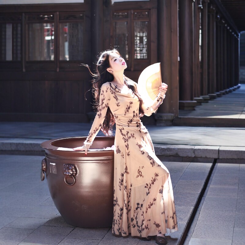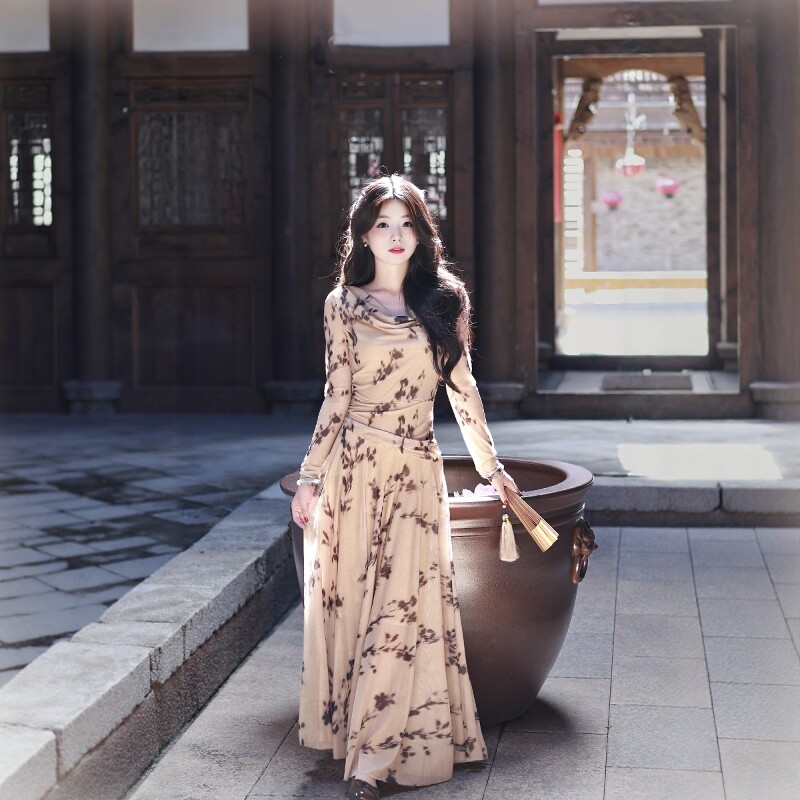 收腰显瘦新中式 休闲长袖 气质长裙艺术印花裙 印花连衣裙女夏季 法式