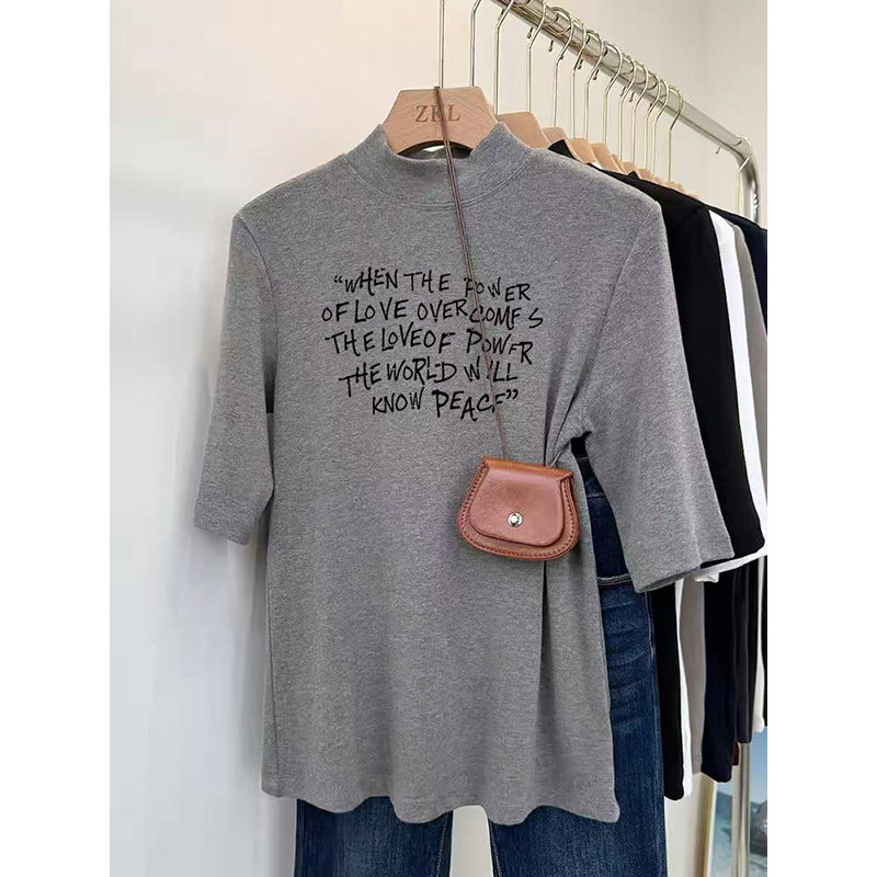 胖mm遮肉显瘦半袖 大码 上衣 T恤女春夏设计感立领打底衫 宽松五分袖