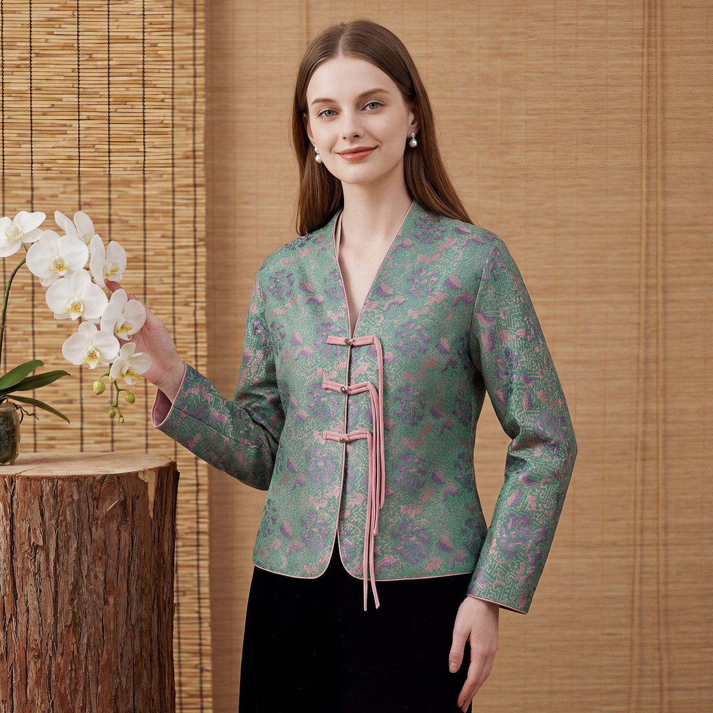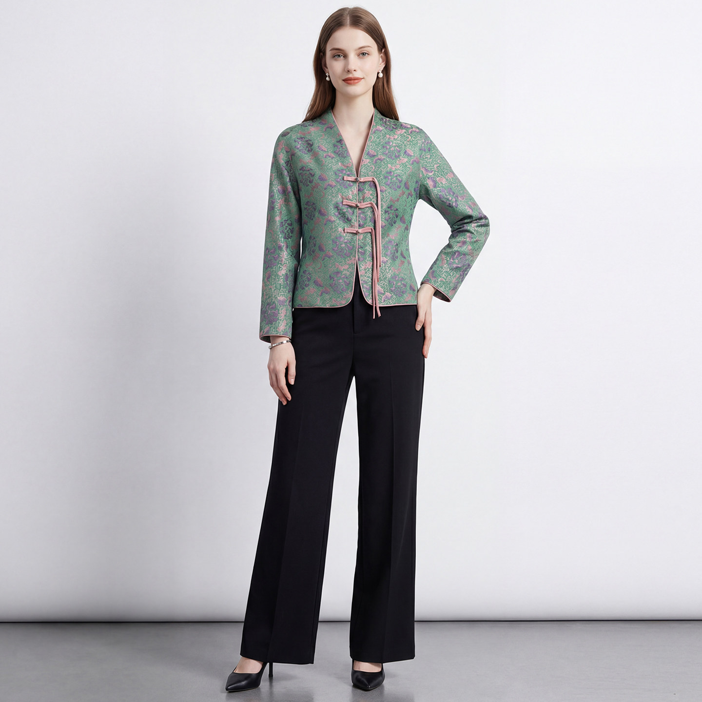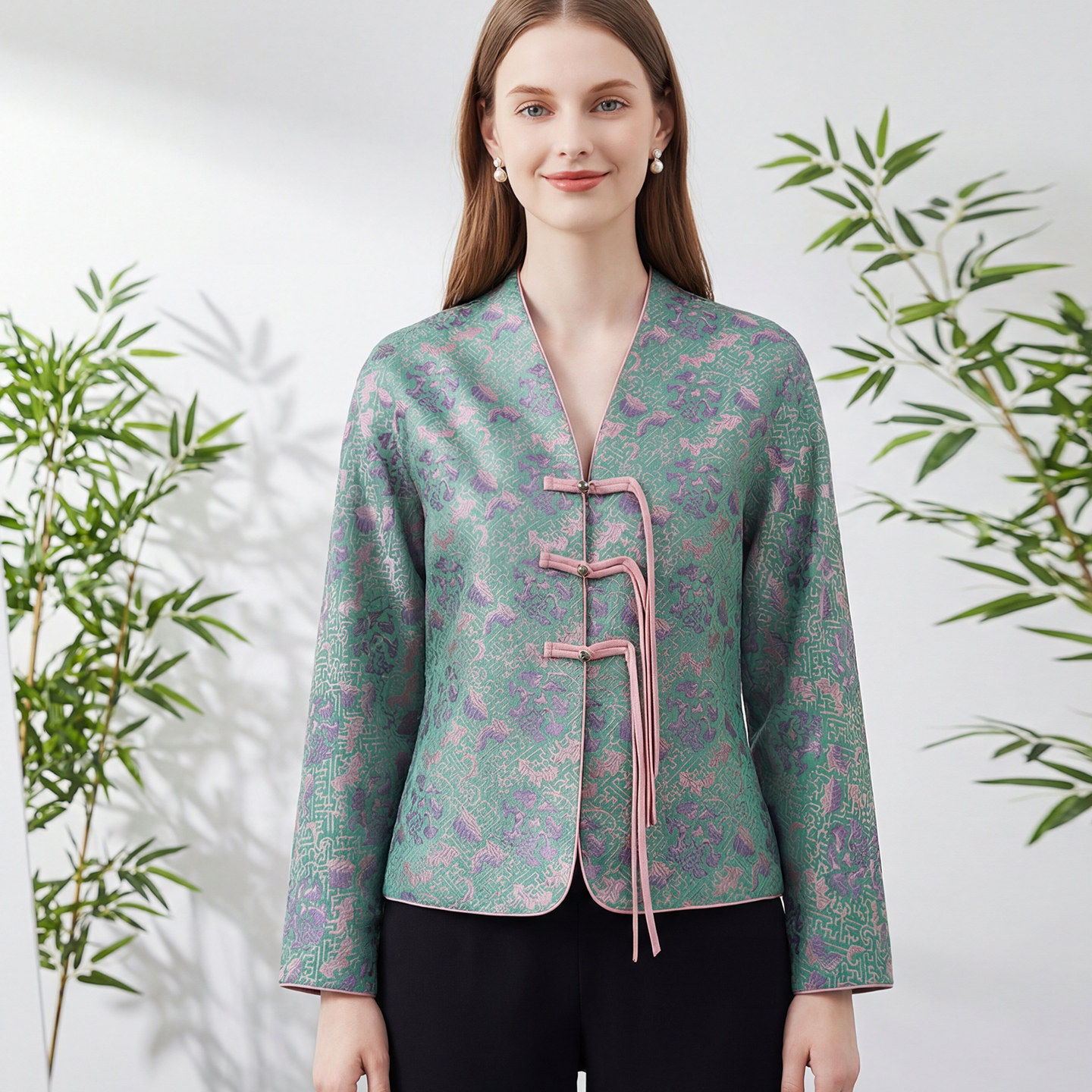 气质女装 马天奴女装 绿色国风提花盘扣外套V领短款 新中式 春夏新款