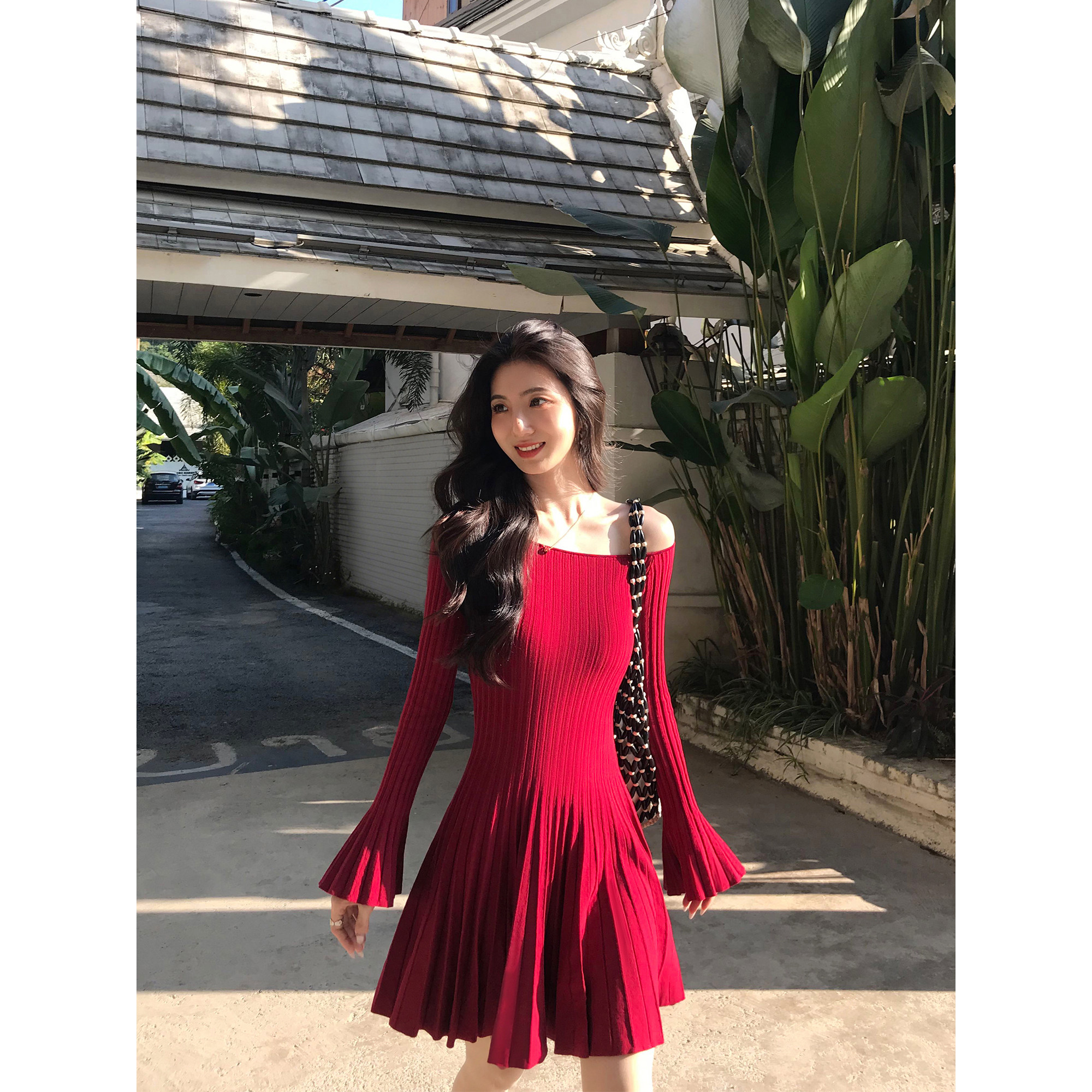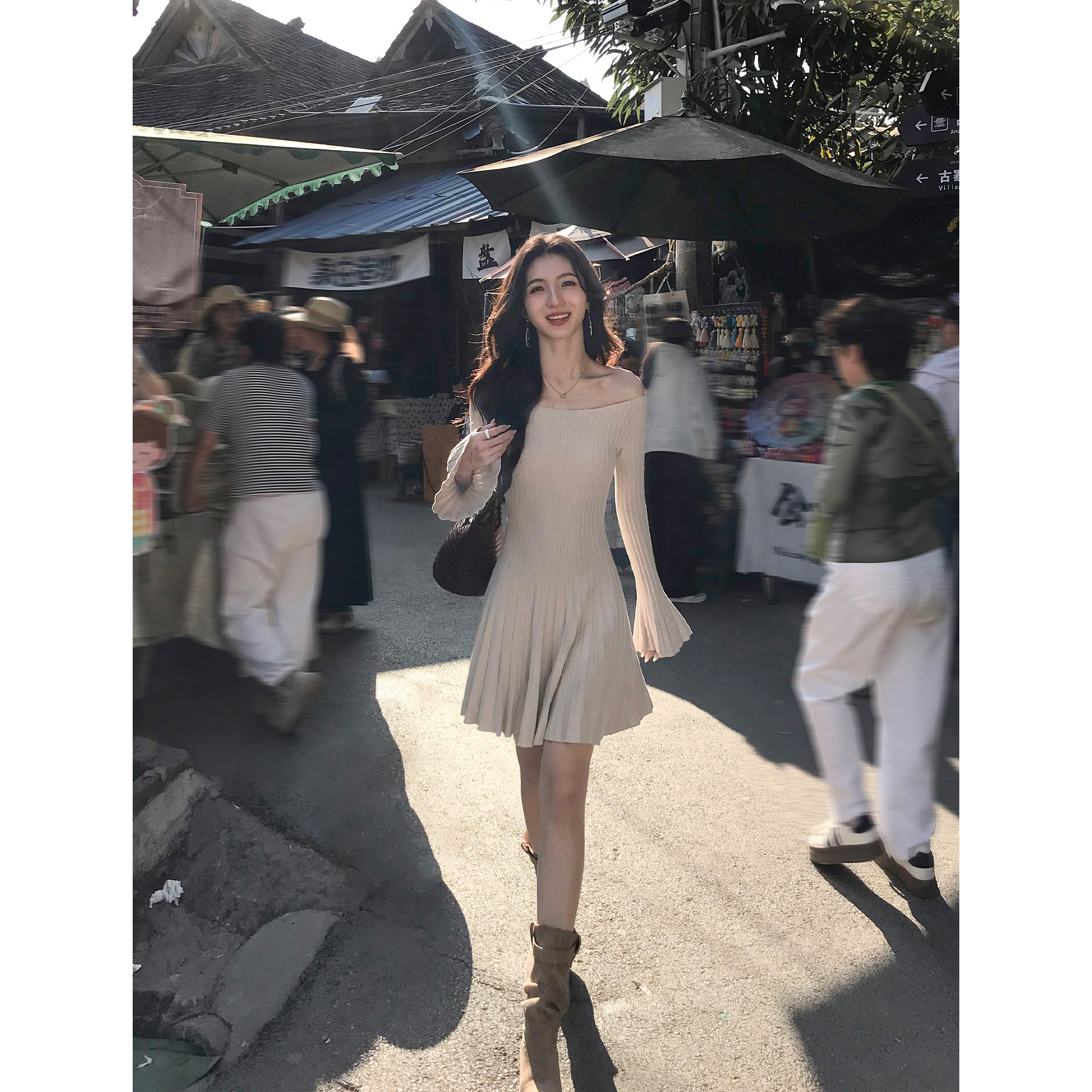 MULVAN 气质针织露肩连衣裙女大船领收腰显瘦a字短裙子 温柔序曲