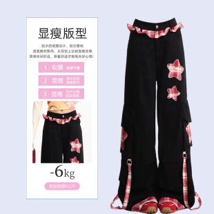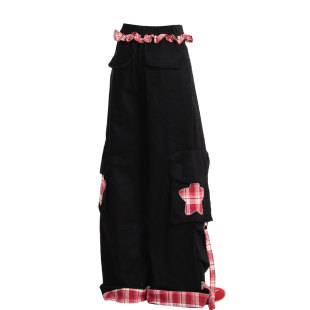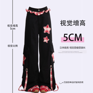 高街阔腿裤 特大码 子美式 女胖mm黑色裤 格纹拼接设计褶皱花边牛仔裤