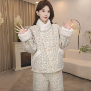 洋气宽松居家服两件套 新款 甜美加厚碎花毛绒绒立领睡衣套装 女冬季