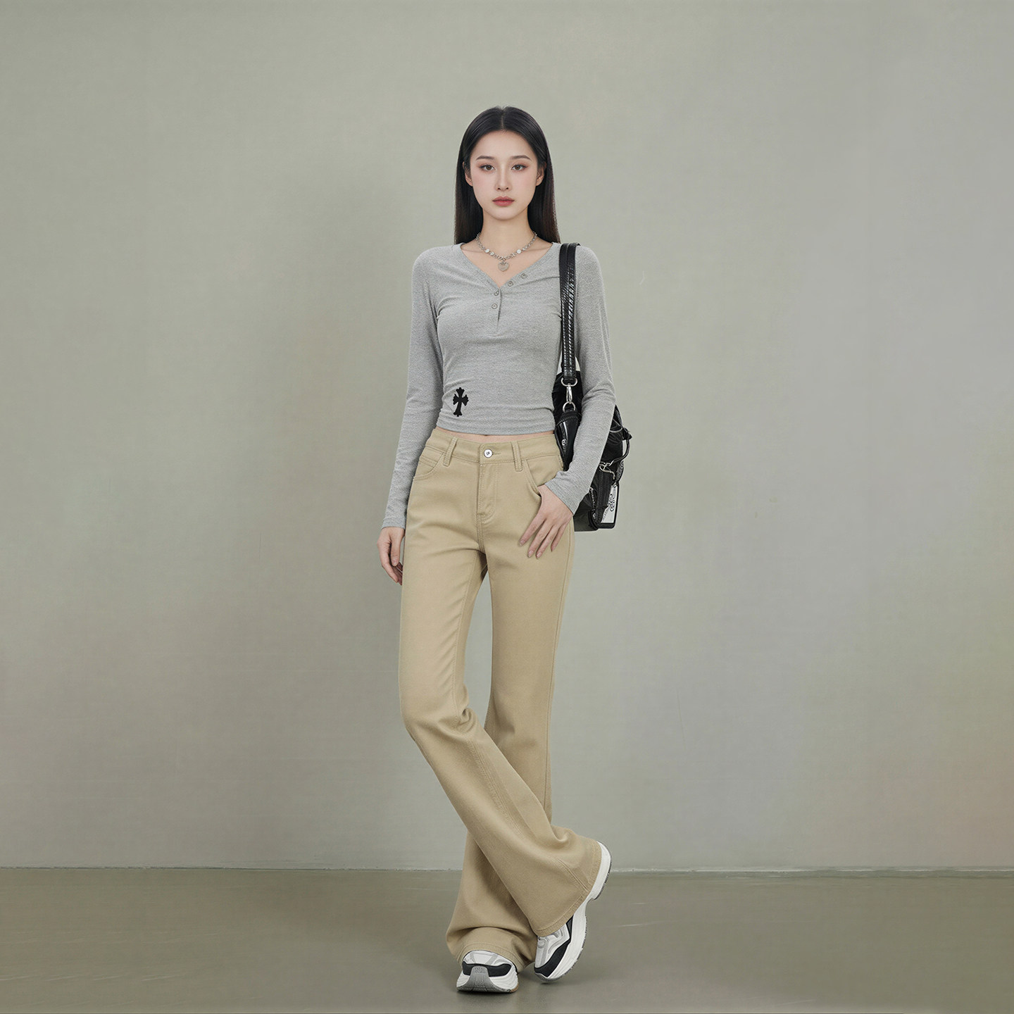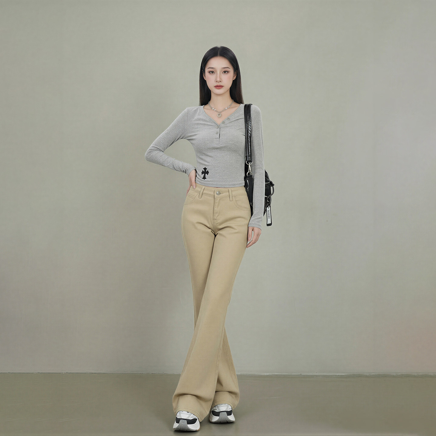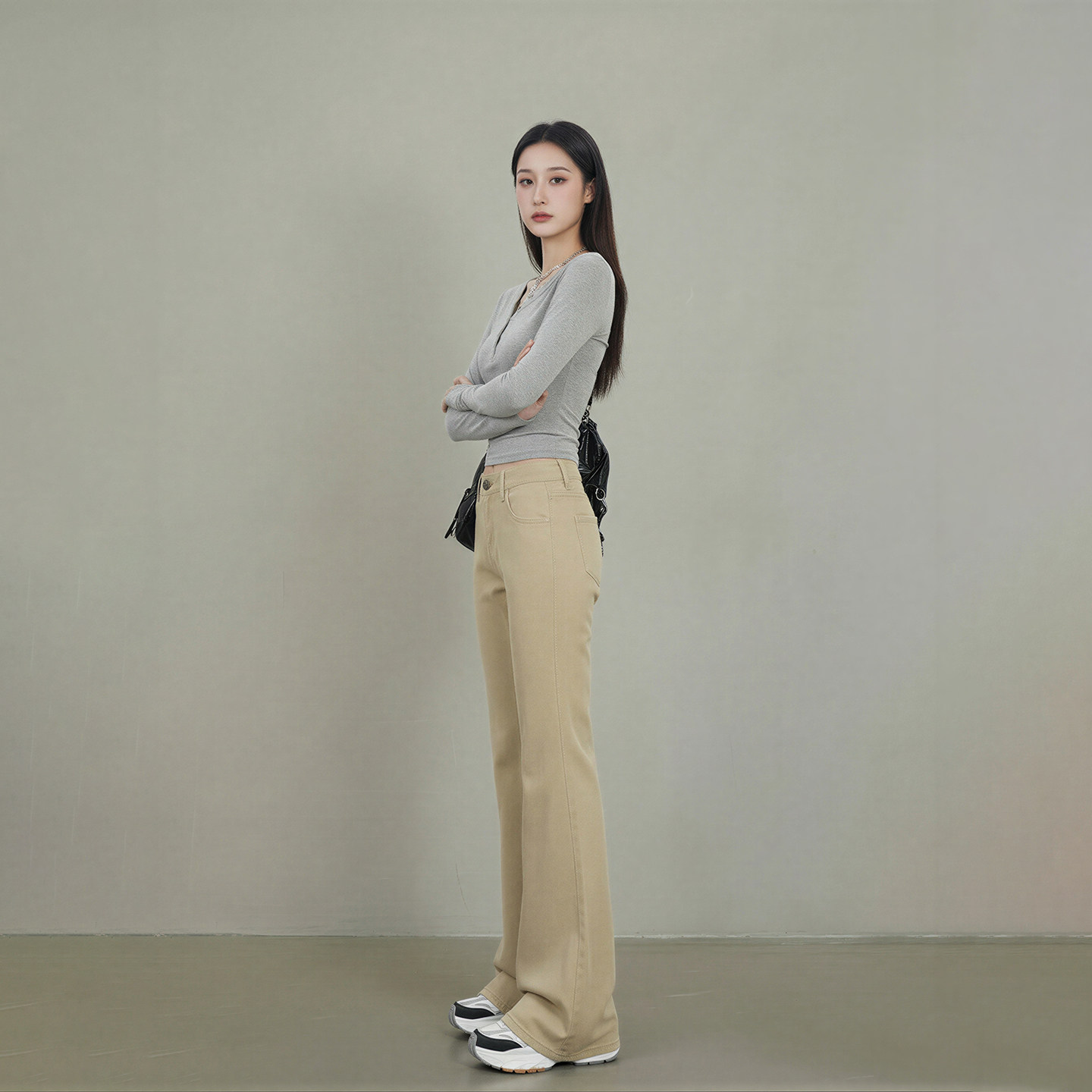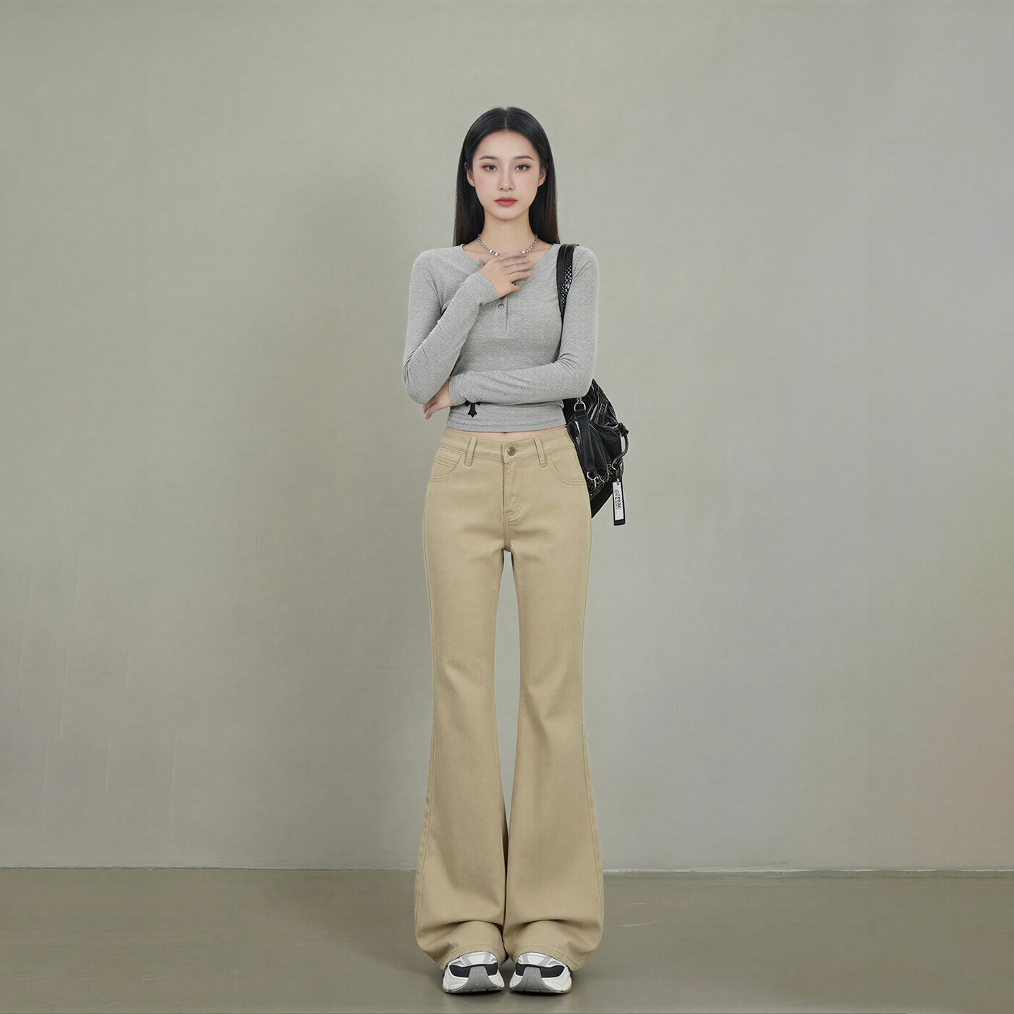 不贴腿宽松微喇直筒拖地裤 新款 女2026春季 艾格卡其色喇叭牛仔裤