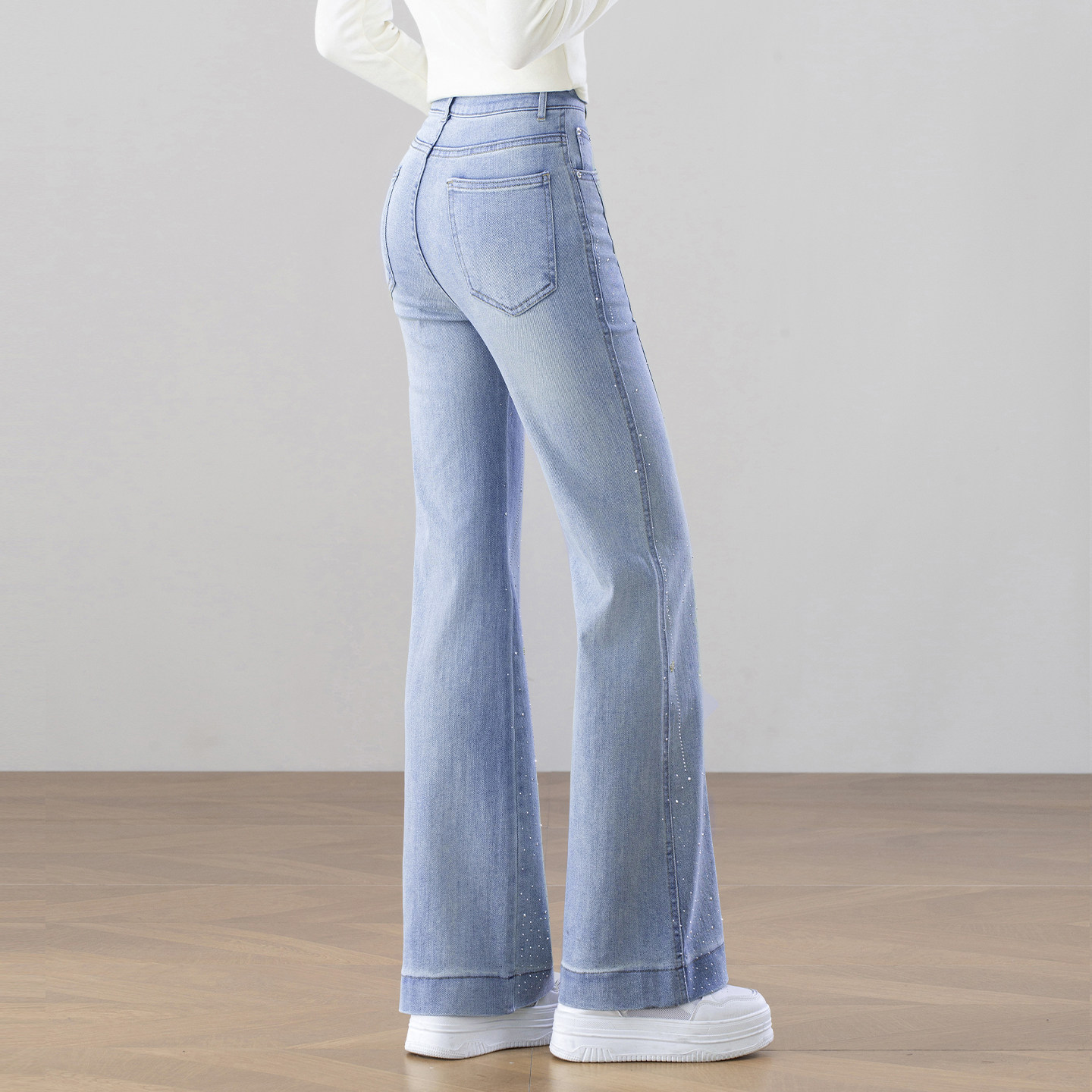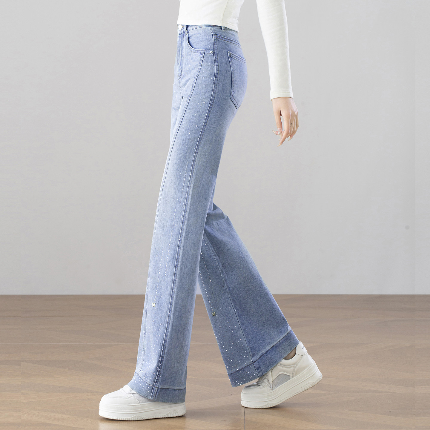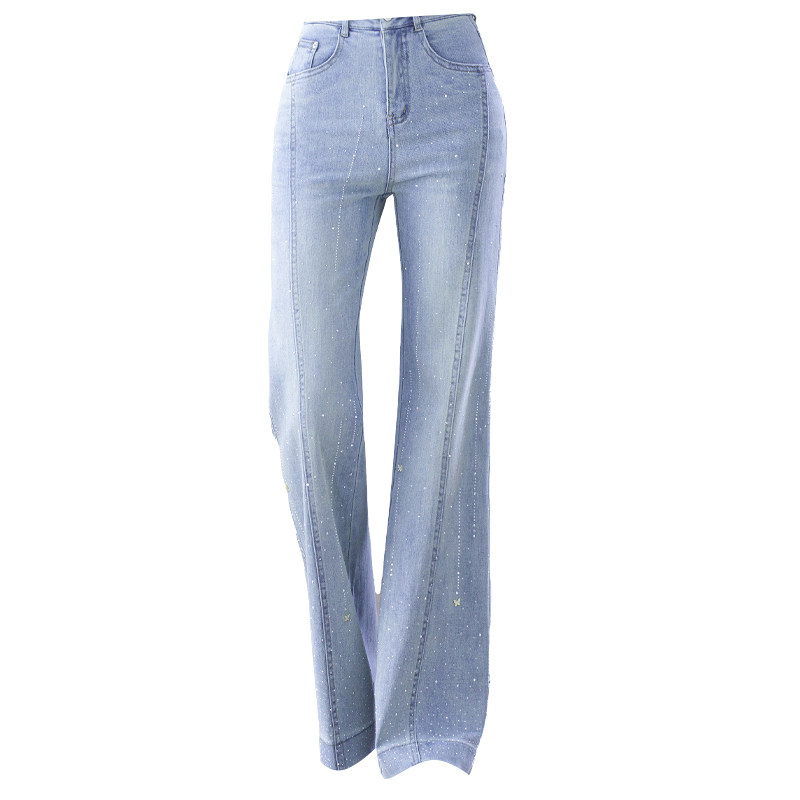 女春季 长裤 2026新款 喇叭裤 高腰显瘦修身 浅蓝色繁星烫钻微喇牛仔裤