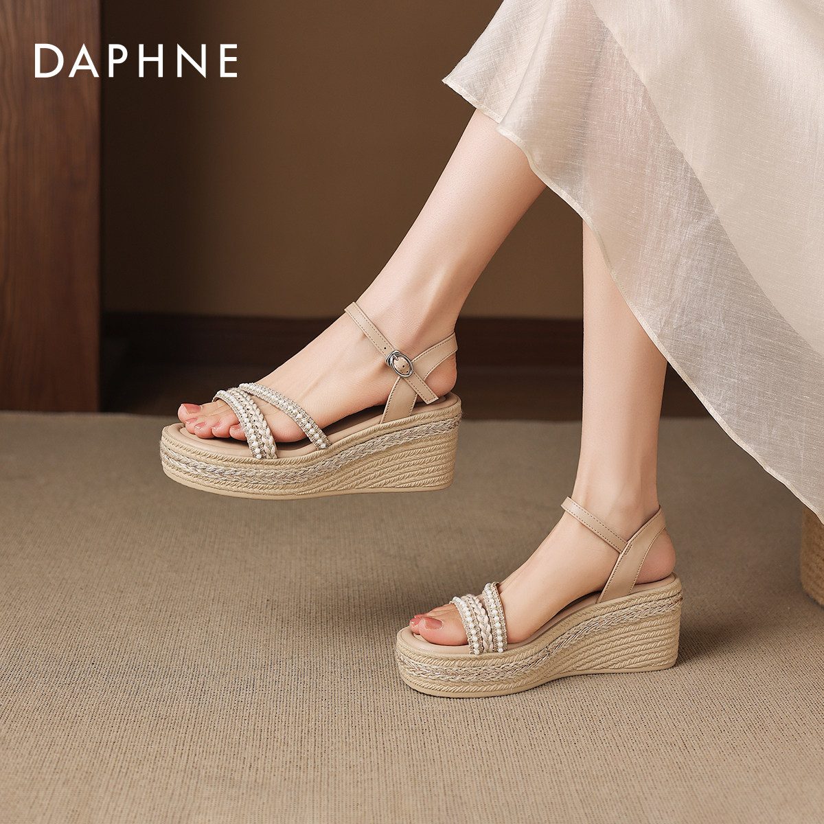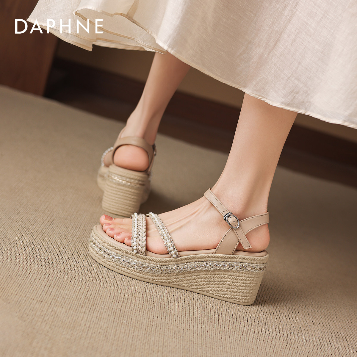 女款 坡跟妈妈女鞋 夏季 2026新款 编织罗马凉拖 高跟鞋 达芙妮厚底凉鞋