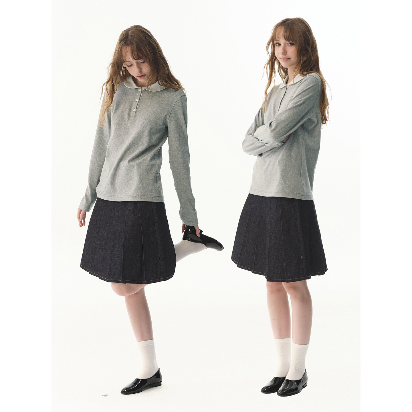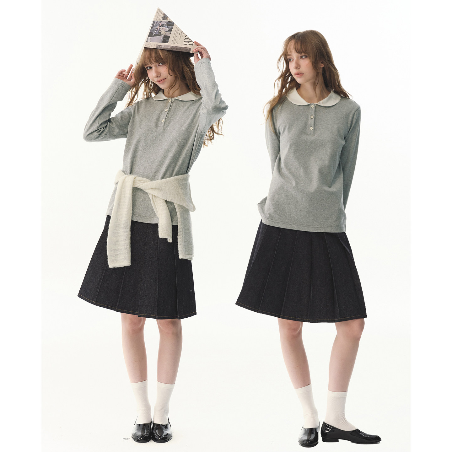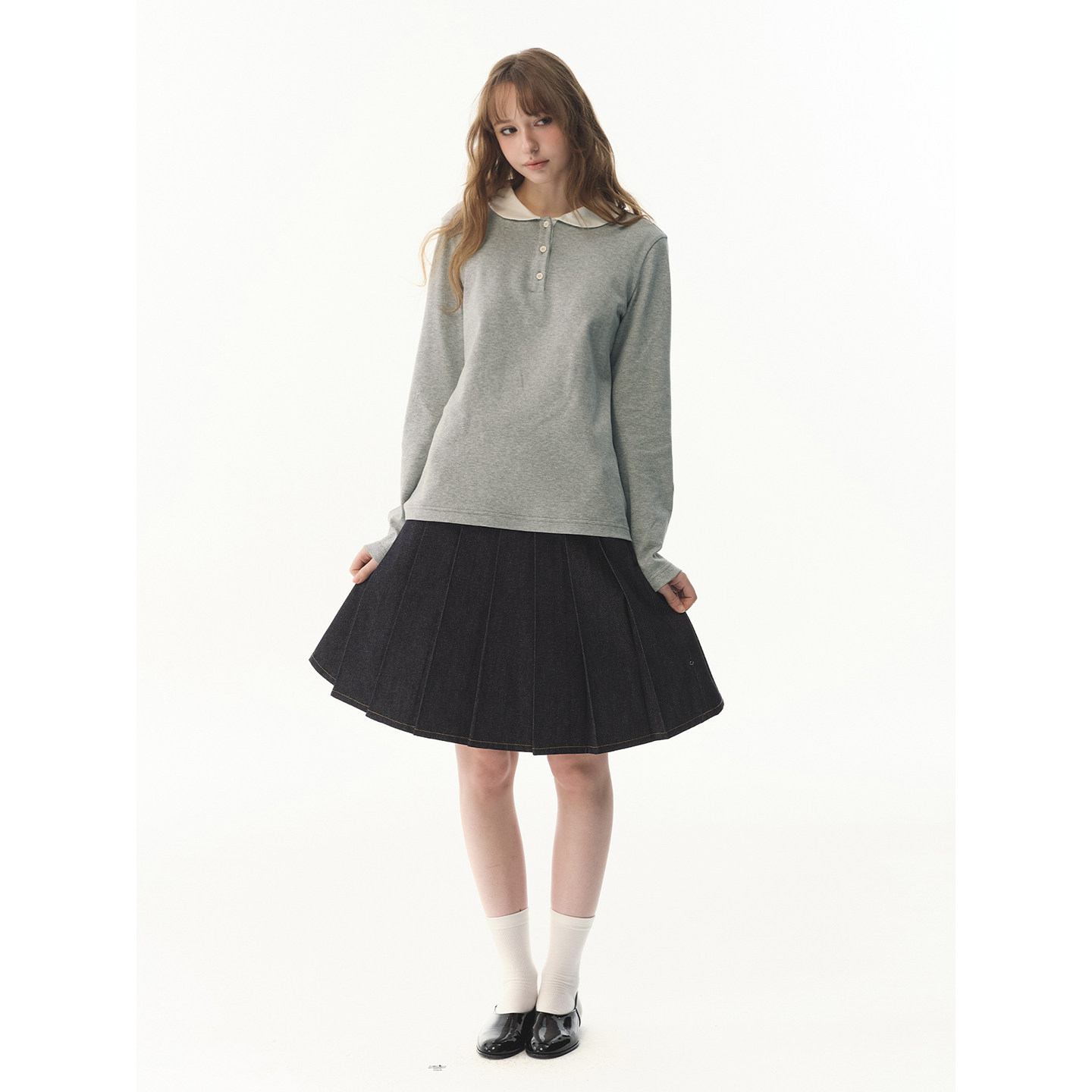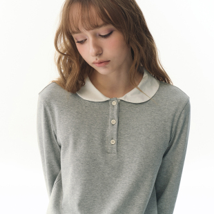 UNRETRO娃娃领撞色半开衫 T恤女甜酷少女合身叠穿打底上衣 正肩长袖