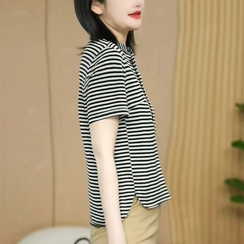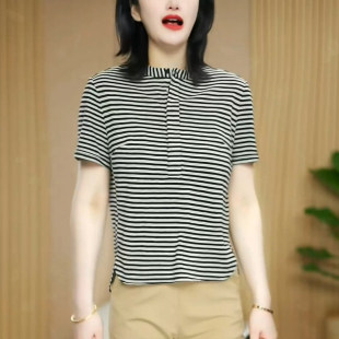 小衫 新款 时尚 2026夏季 恤立领正肩感妈妈洋气t女 上衣条纹设计短袖