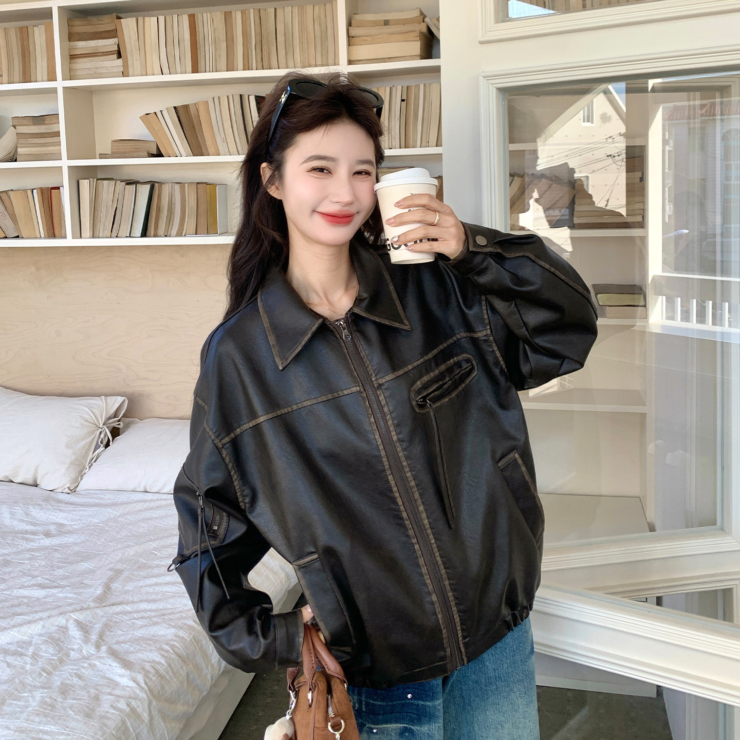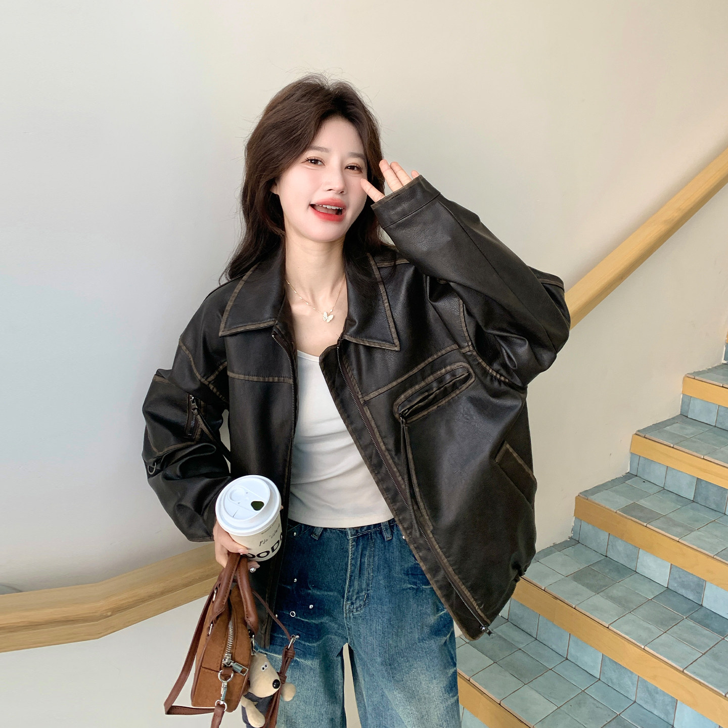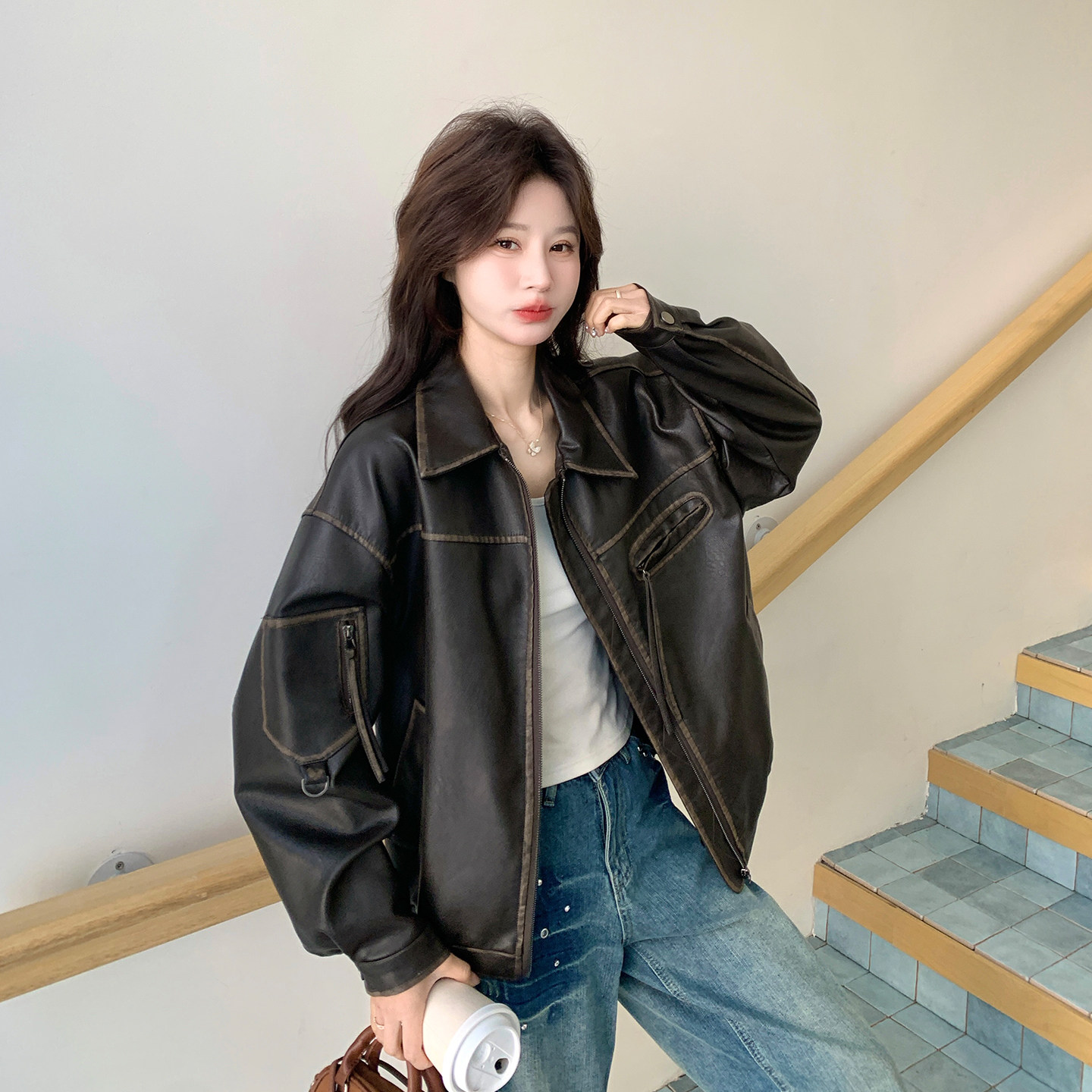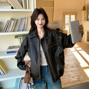 棕色复古又酷又飒PU皮衣外套2026春天新款 休闲机车风翻领夹克 时尚