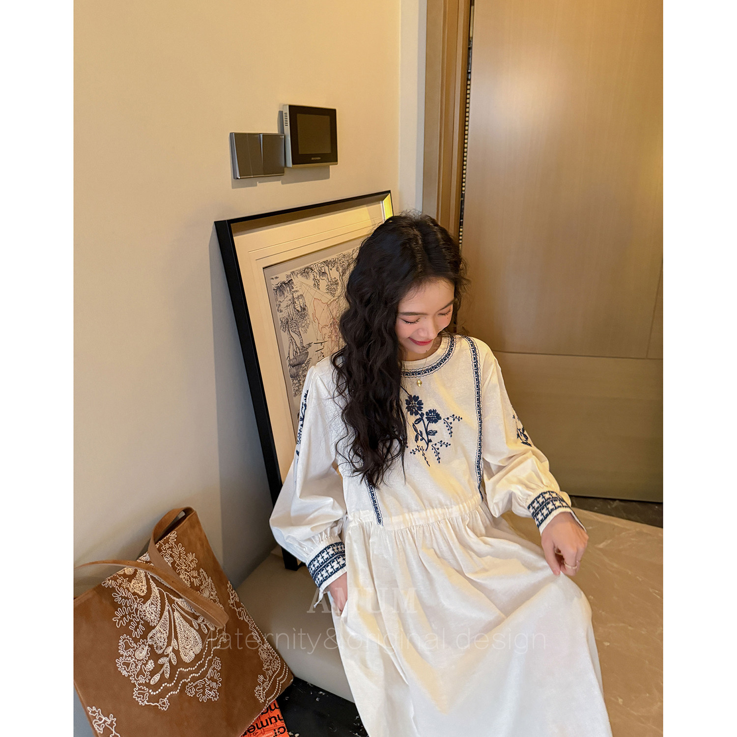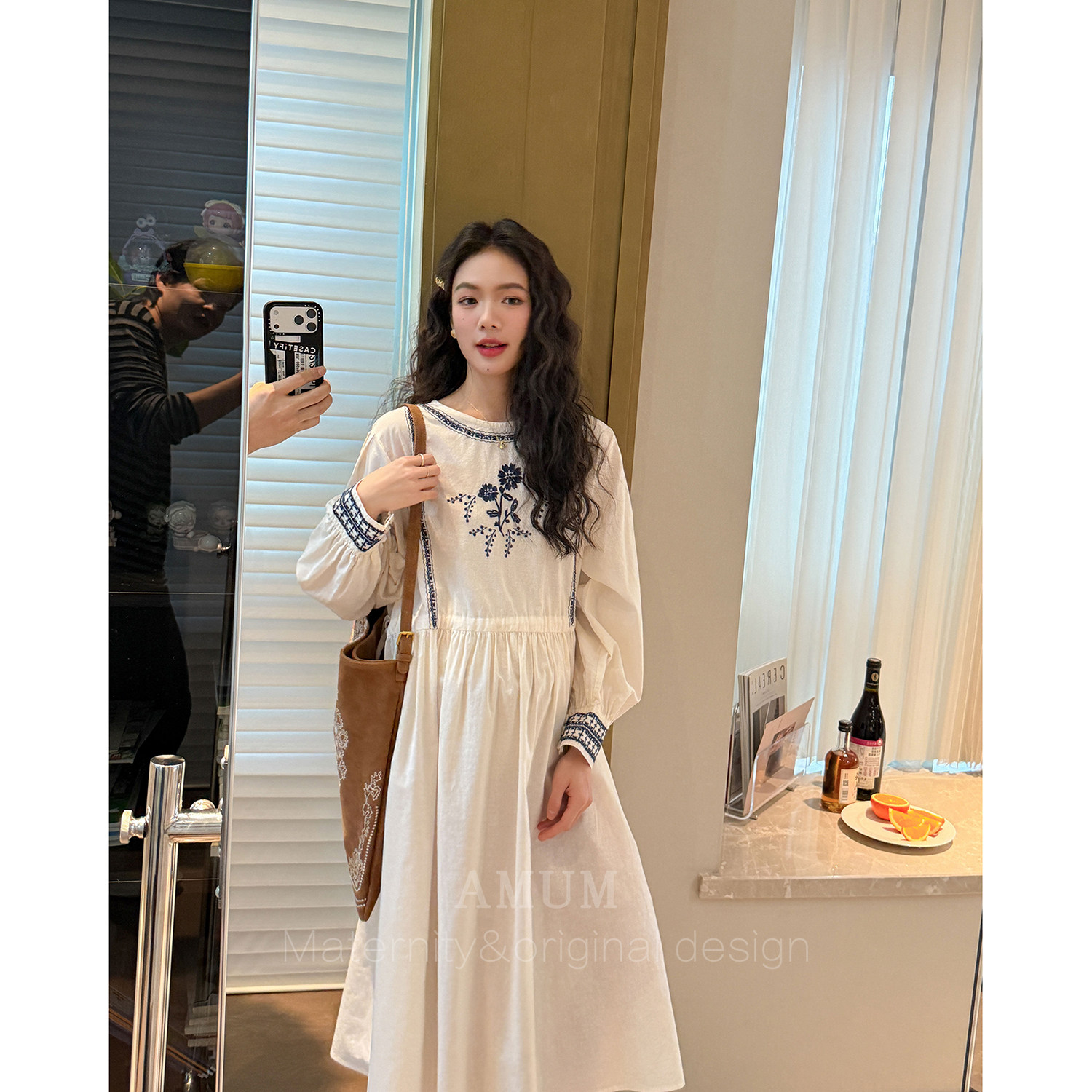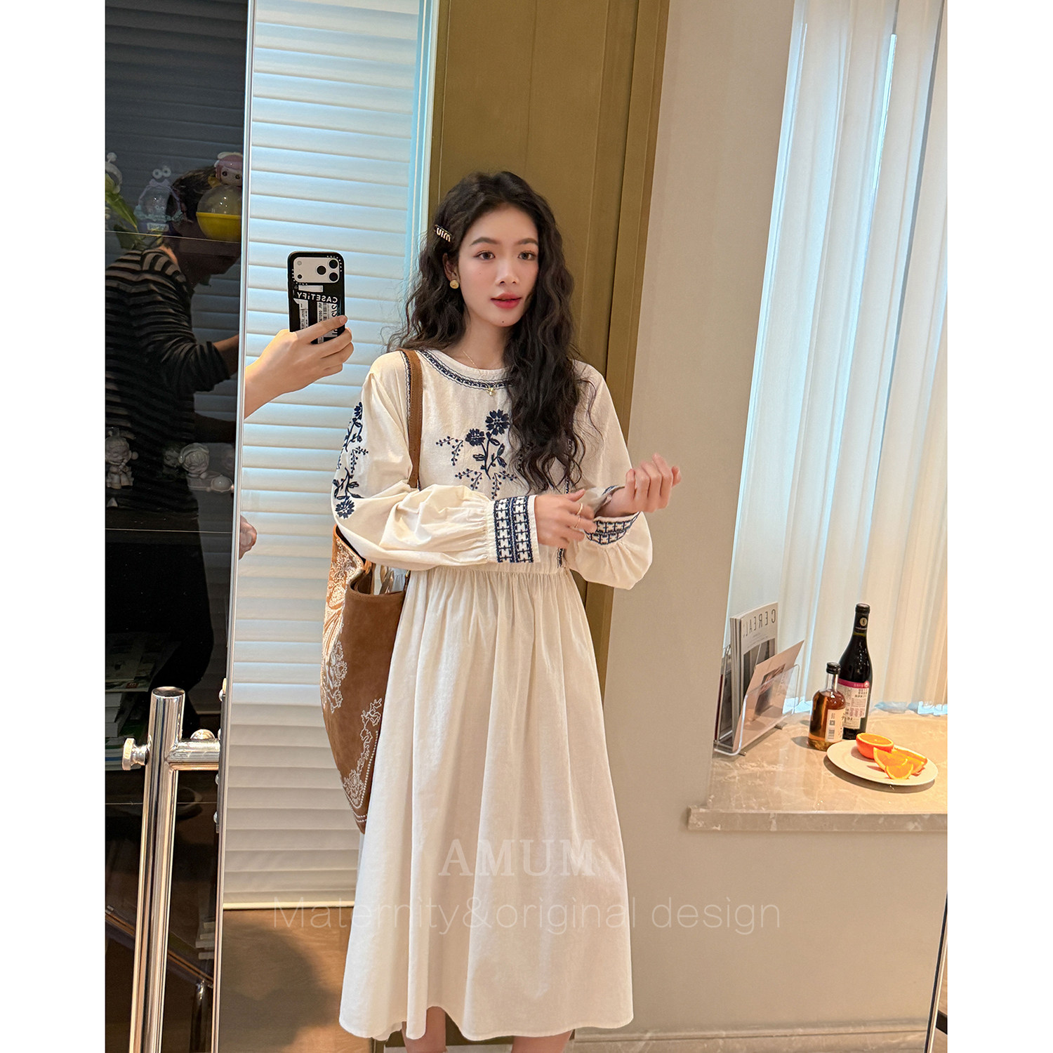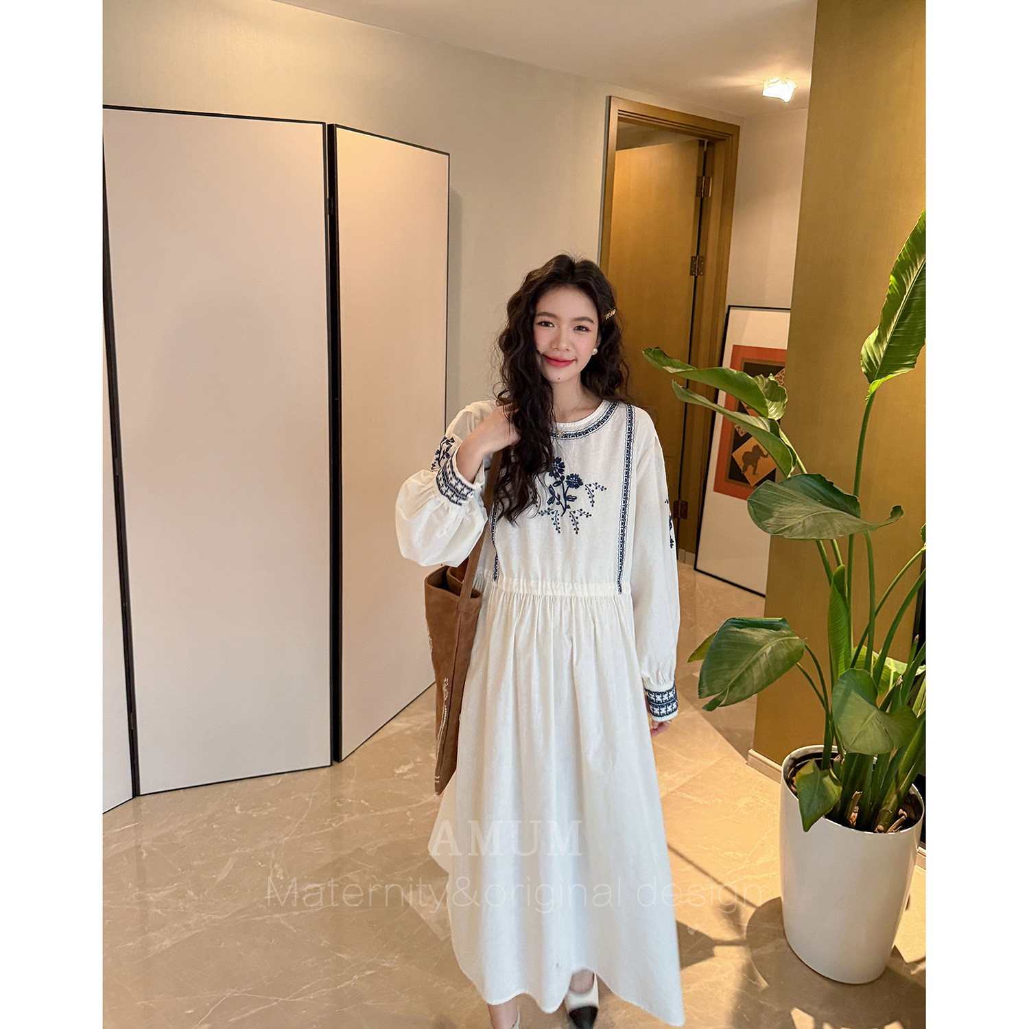 森系刺绣青花宽松文艺不显怀孕期漂亮裙子 民族风 AMUM孕妇装