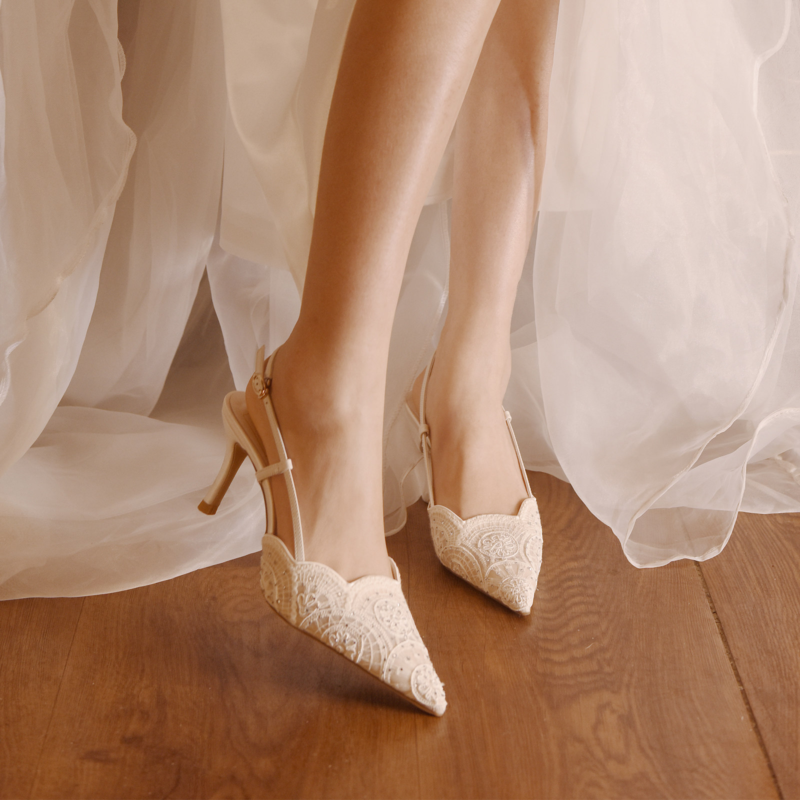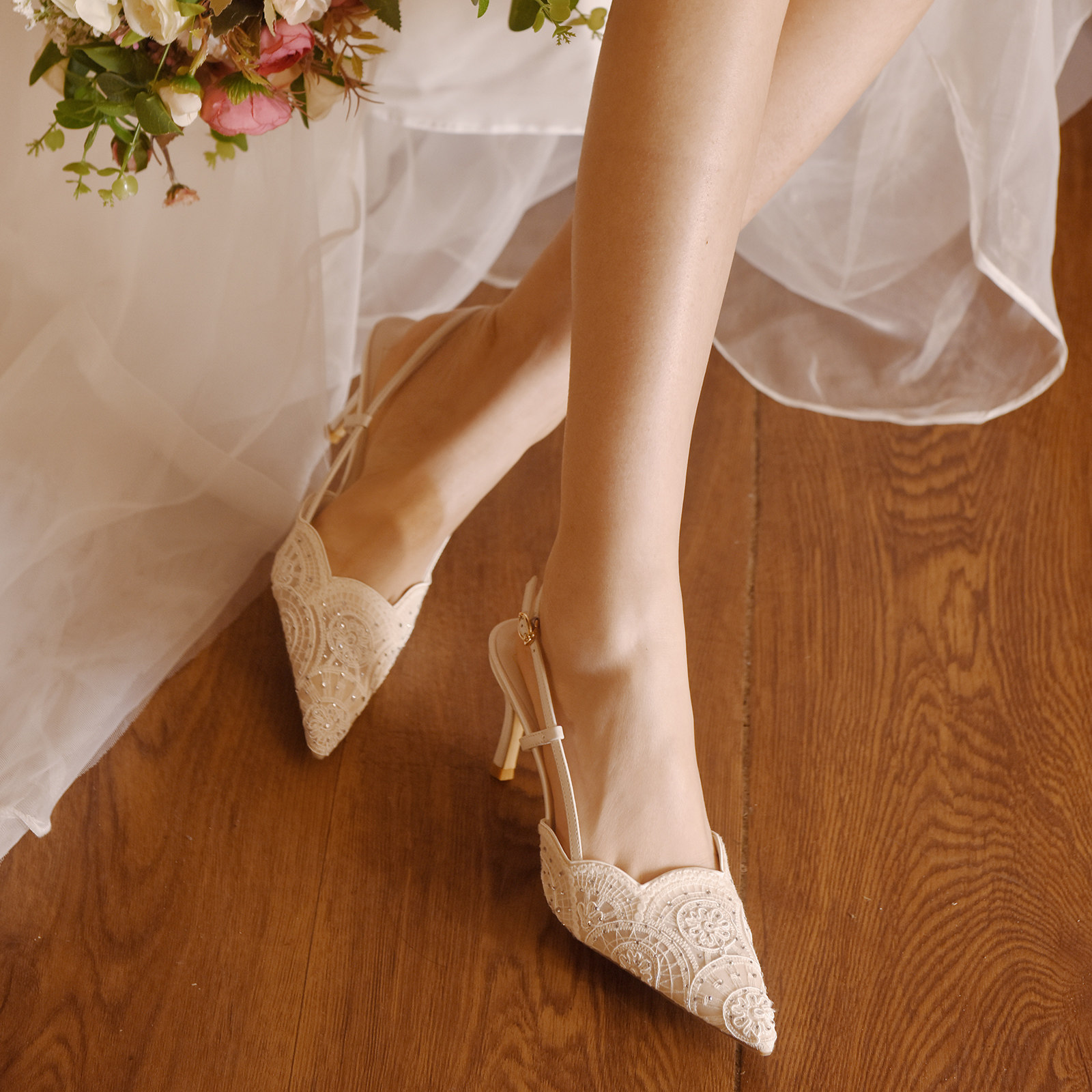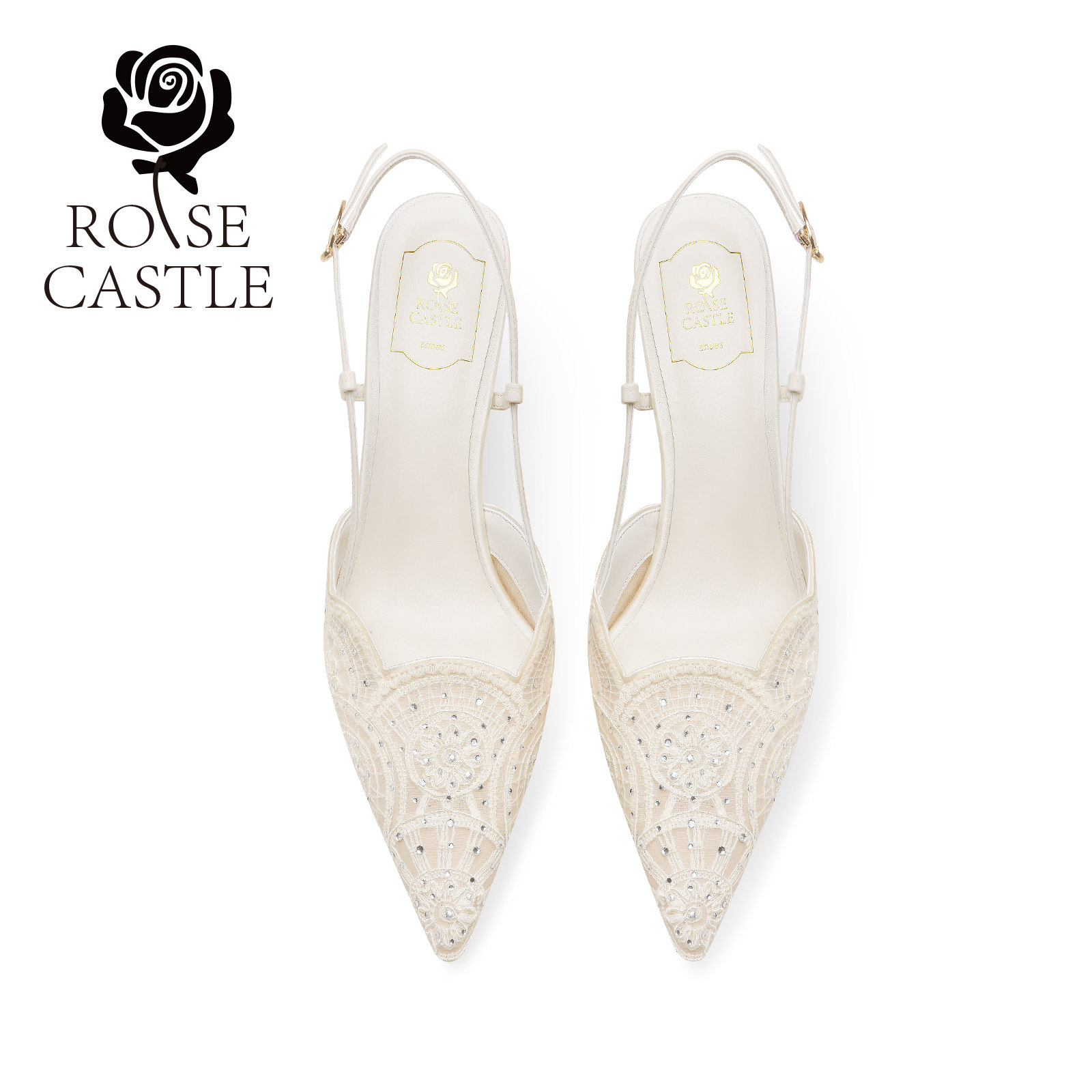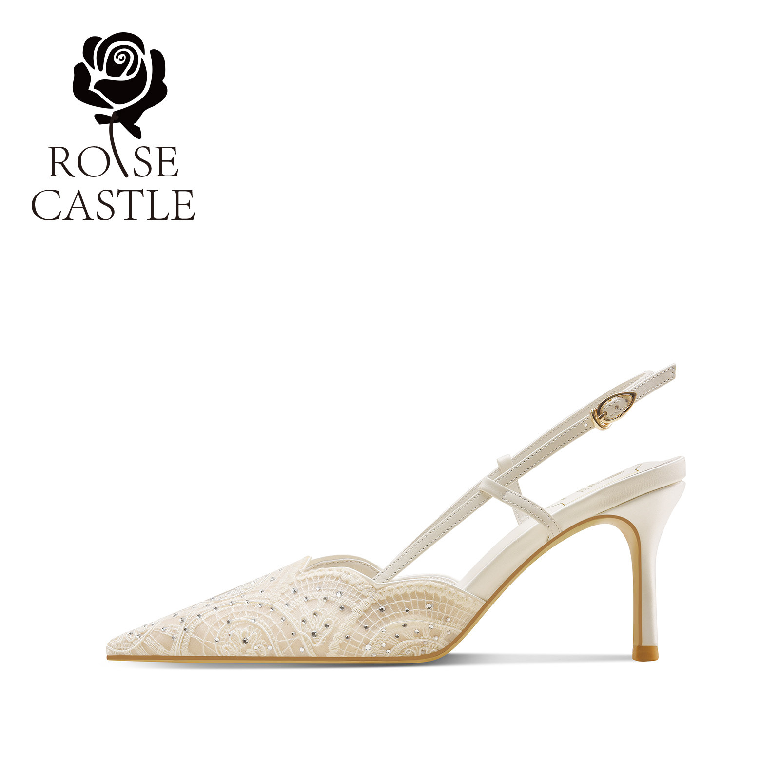 rosecastle 白色蕾丝高跟鞋 婚鞋 夏款 女日常两穿后空单鞋 月白共舞