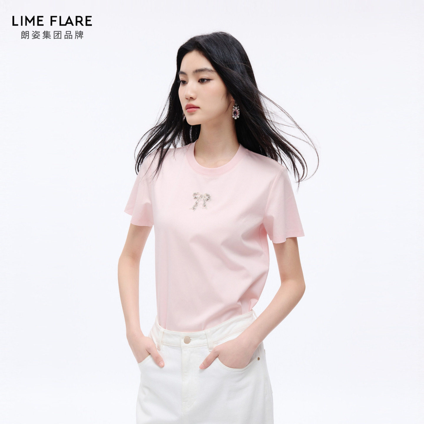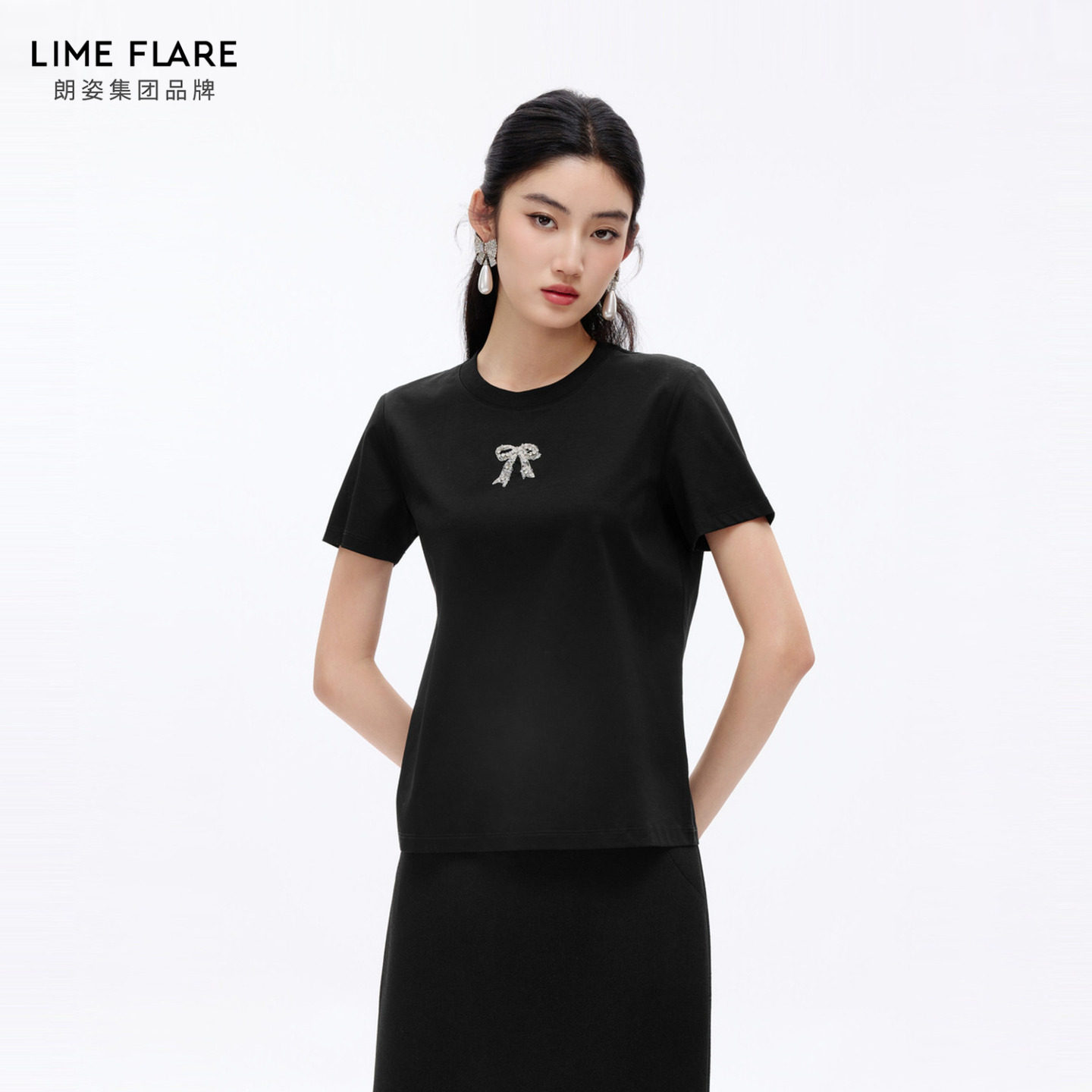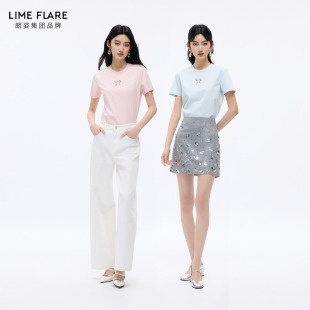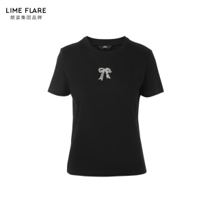 朗姿莱茵福莱尔手工蝴蝶结钉钻简约休闲百搭圆领短袖 纯色T恤26夏