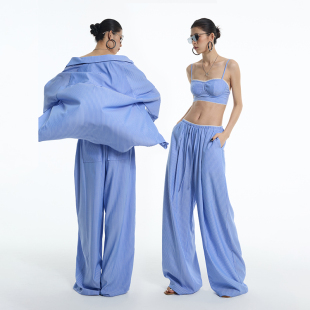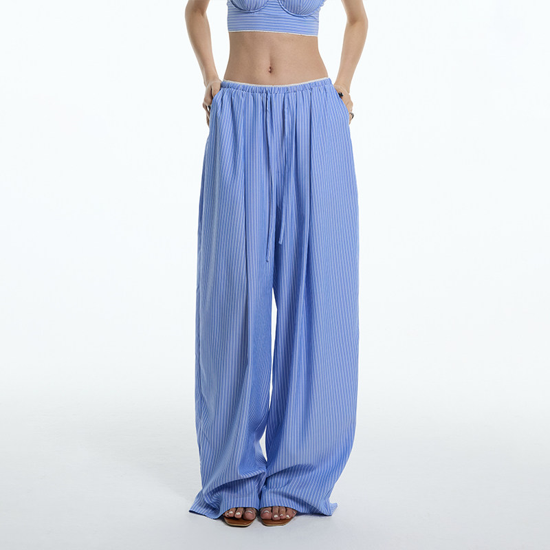 蓝白条纹花边腰头松弛显瘦遮肉阔腿春夏休闲裤 ourhour 航海度假