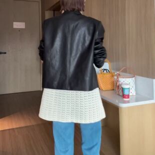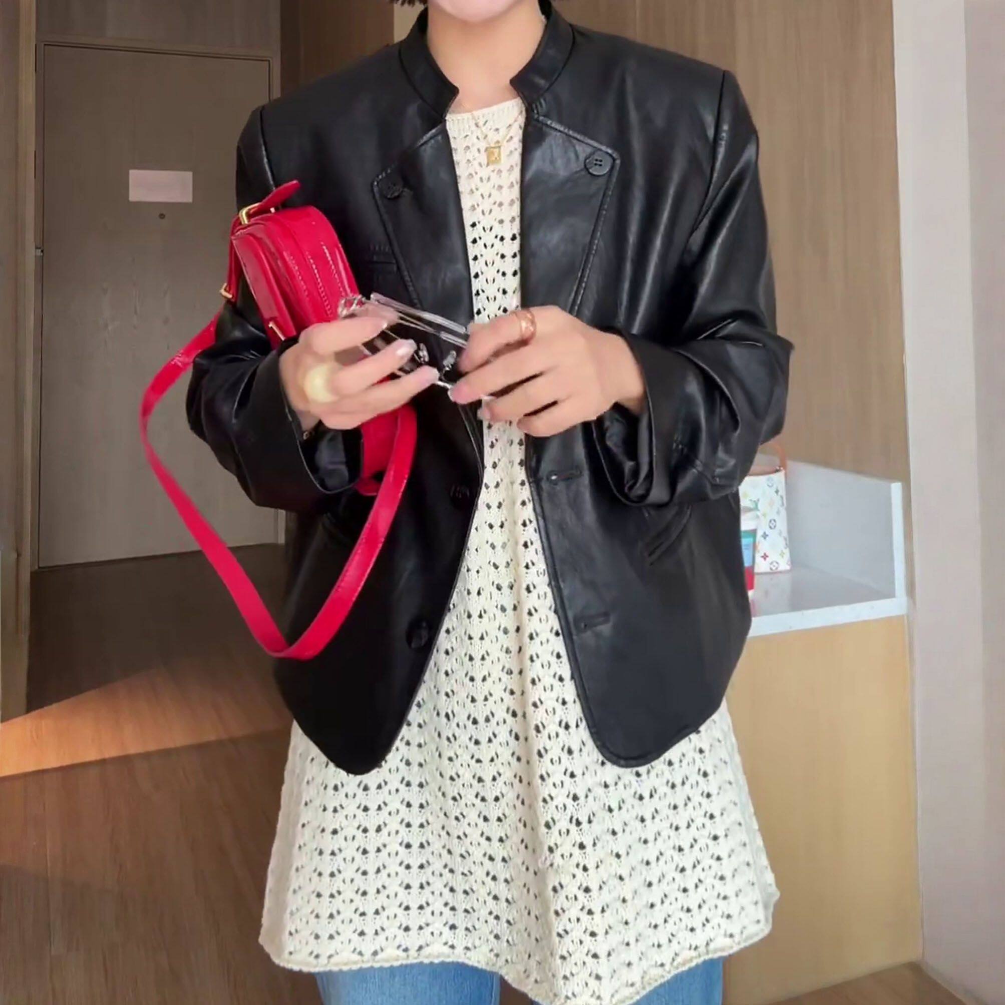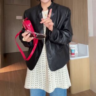 外套女 洋气设计感纯色圆领上衣休闲百搭显瘦皮衣个性 2026春季 新款
