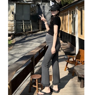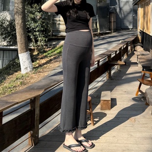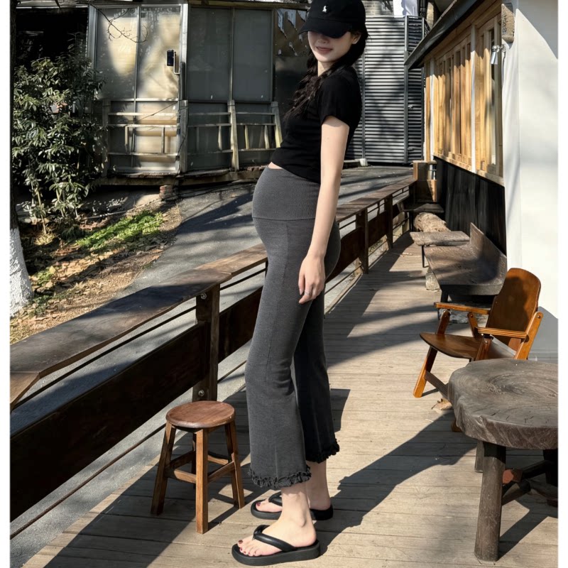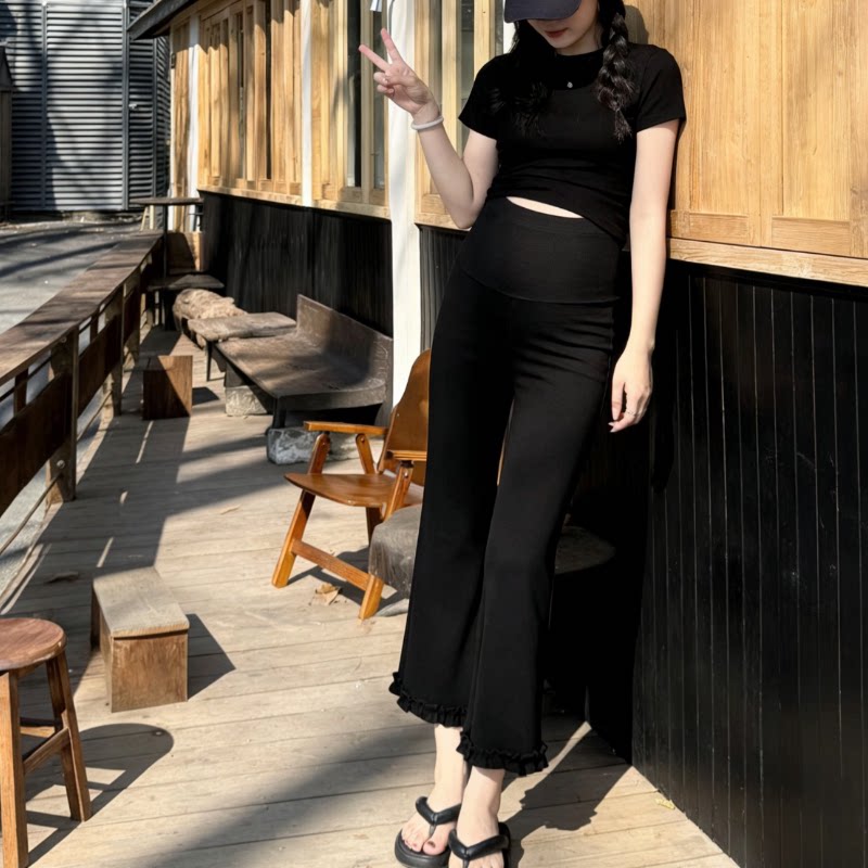 新款 外穿九分裤 黑色高腰辣妈孕期 托腹不勒肚子显瘦花边时尚 孕妇裤